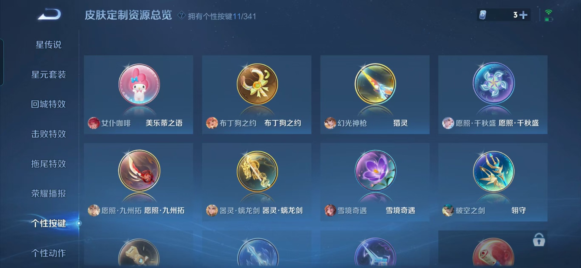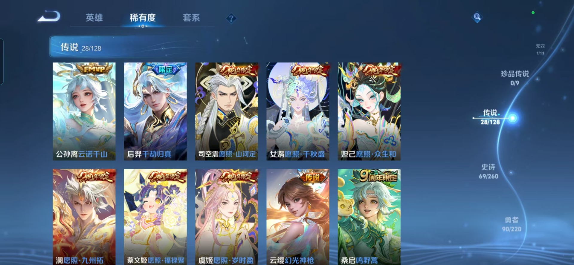 不知火舞绯月行,司空震愿照·山河定,裴擒虎李小龙,桑启鸣野蒿,女娲愿照·千秋盛,孙悟空孙行者,孙悟空至尊宝,盘古冰霜神祇,云中君时之祈愿,妲己愿照·众生和,蔡文姬愿照·福禄聚,澜愿照·九州拓,虞姬愿照·岁时盈