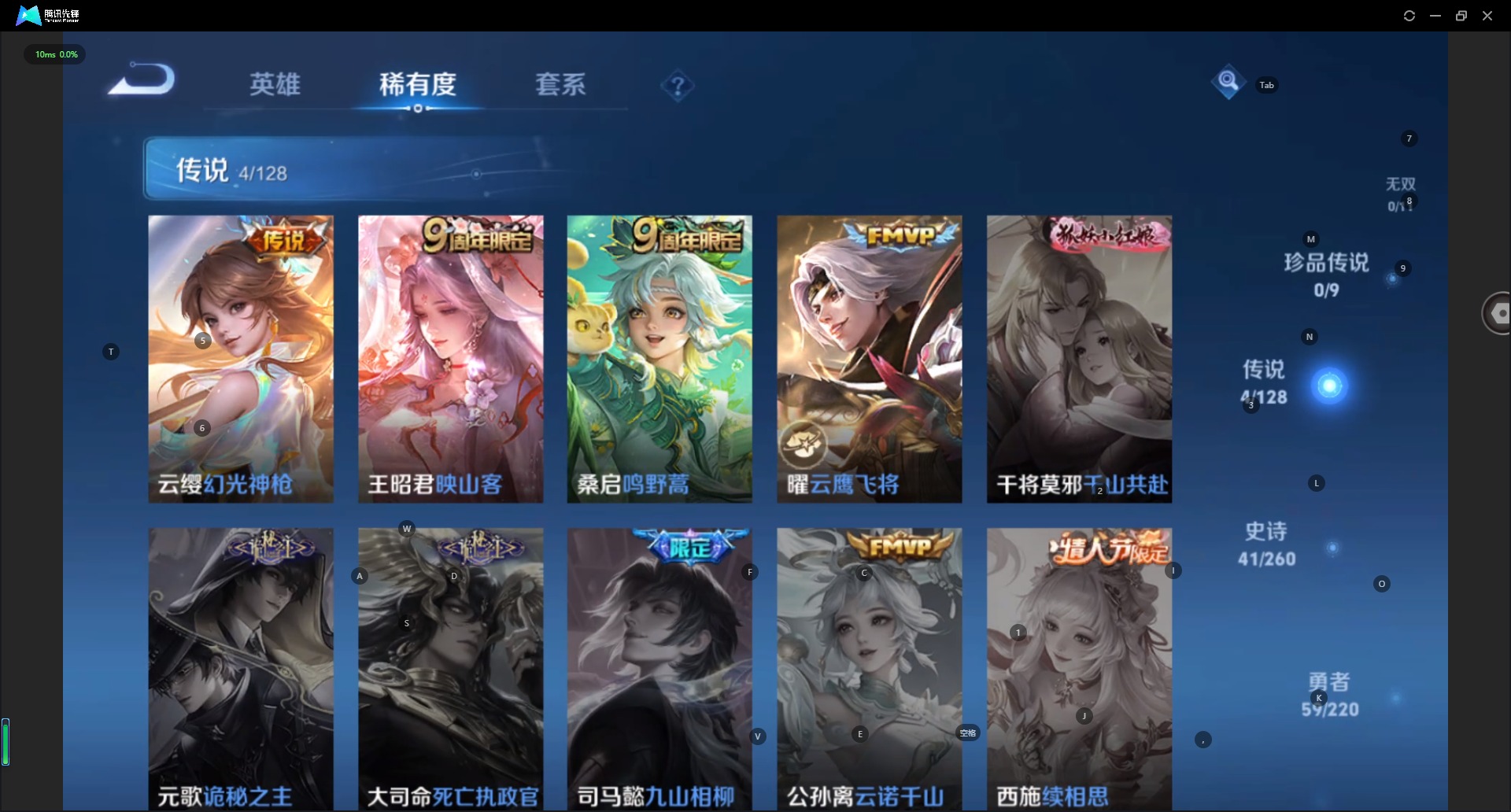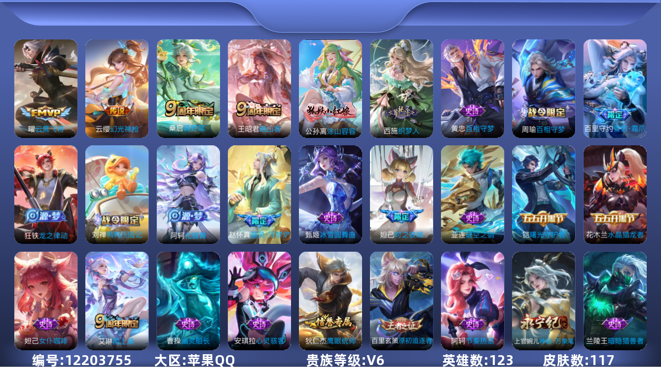 [12203755]V6 4传说 123英雄 117皮肤 可修改实名 优质装备:云鹰飞将(小将军),涂山容容 传说皮:幻光神枪 限定皮:映山客,陌上桑,鸣野蒿,时之彼端,神器·万象笔 史诗皮:鸭鸭历险记-刘禅,器灵·浮梦炉,化蝶舞,龙之律动,雪豹·霜爪,百相守梦-周瑜,茶境仙,破空之剑,百相守梦-黄忠,织梦人,乱世虎臣,节奏热浪,女仆咖啡,水果甜心,心灵骇客,功夫厨神,暗隐猎兽者,幽灵船长,鬼剑武藏,心灵战警,舞动绿茵,缤纷独角兽,逐浪之夏,水晶猎龙者,曙光守护者,原初追逐者,圣诞狂欢,鹰眼统帅,暗夜贵公子,魅力维加斯