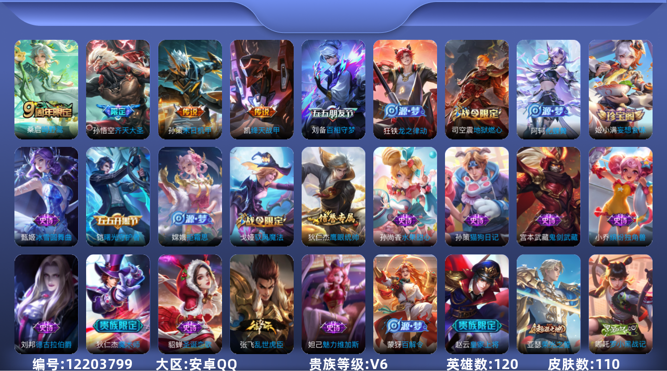 - [11884585]无双贵族 5典藏 36传说 123英雄 354皮肤 典藏英雄武则天 可修改实名 优质装备:倪克斯神谕(宇宙婆娘),无限飓风号(高达),大秦宣太后,鸣剑·曳影,银白咏叹调(倪克斯侍卫),冠军飞将,绛天战甲(鸡嘴战神),猫影幻舞,久胜战神,末日机甲-孙尚香(绿蚂蚱),地狱火,仲夏夜之梦(大飞蛾),音你心动-小乔,零号·赤焰,海洋之心,地狱之眼,胖达荣荣,李逍遥,乞巧织情,时之恋人-刘备(电焊工),游龙清影(小青龙),超时空战士-狄仁杰,花朝如约(花篮子),山海·炽霜斩(李信年限),山海·琳琅生(小乔年限),山海·苍雷引(电光曜子),艾琳觅芳踪 珍宝阁皮:优雅恋人,玩趣恶龙 限定皮:至尊宝,太华(伽罗年限),异界灵契(白毛香),傲雪梅枪,补天,寅虎·展翼(孙膑年限),白鹤梁神女,白晶晶,时雨天司(水龙头),神威(电光马子),玄嵩(庄周年限),山海·碧波行(瑶年限),遇见飞天,高山流水,齐天大圣,匿光决锋者,五谷丰年,武圣,天狼运算者,游园惊梦,御风骁将(吕布年限),天狼溯光者,奔雷神使(牛魔年限),祈雪灵祝(雪兔子),天狼绘梦者,李小龙,逐梦之影,如梦令-嫦娥,如梦令-后羿,霸王别姬-项羽,霸王别姬-虞姬,孙行者,猪悟能,一生所爱,天魔缭乱,青春决赛季,乒乒小将,蜜橘之夏,神奇女侠,匿光追影者,女儿国国王,寅虎·御盾(廉颇年限),寅虎·瑞焰(虎皮蛋子),寅虎·心曲(虎婆),寅虎·赤拳(老虎年限),时之祈愿-云中君,时之祈愿-瑶(瑶传限),百木心枪,玉兔公主,启示之音,无尽星芒,山海·玄木吟(马可年限) 史诗皮:紫霞仙子,苍穹之光,白龙吟,黄金分割率,特工魅影,千年之狐,永昼,江河有灵,魅语,无限星赏官,冰冠公主,偶像歌手,晚萤,暗夜猫娘,龙骑士(小龙虾),末日机甲-吕布,猫狗日记-孙策,时之恋人-孙尚香,乱世虎臣,节奏热浪,修罗,女仆咖啡,摇滚巨星,水果甜心,绅士熊喵,天才门将,星夜王子,心灵骇客,时之奇旅-安琪拉,功夫厨神,德古拉伯爵,暗隐猎兽者,幽灵船长,鬼剑武藏,心灵战警,天秀·启明,舞动绿茵,地狱岩魂,纤云弄巧,繁星吟游(呼啦呼啦),拒霜思,缤纷独角兽,乘风破浪,逐浪之夏,水晶猎龙者,曙光守护者,金属风暴,圣诞狂欢,圣诞恋歌,鹰眼统帅,魅力维加斯,黎明之约,赏金猎手,奇遇舞章,天秀·音浪,寅虎·御盾,千筹问战,无心,未来纪元-赵云