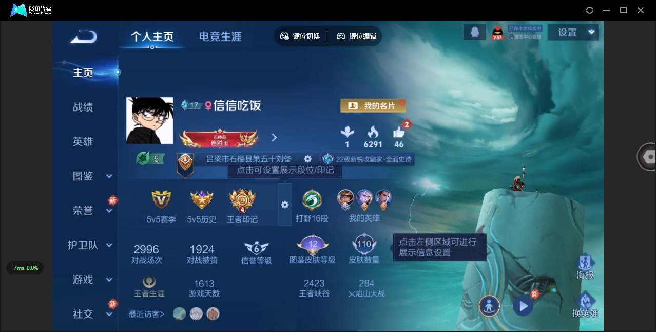 - [11907000]V7 1典藏 1无双 2珍品传说 10传说 121英雄 119皮肤 可修改实名 优质装备:银白咏叹调(倪克斯侍卫),天机白泽,江户川柯南,怪盗基德,黄金射手座,云霓雀翎,末日机甲-孙尚香(绿蚂蚱),超时空战士-狄仁杰,记忆之芯(机甲兔),澜逐花归海,涂山容容 传说皮:九山相柳,云诺千山 限定皮:愿照·岁时盈(虞姬年限),逐霄战戟,鸣野蒿,至尊宝,烈魂 史诗皮:鸭鸭历险记-刘禅,绮世丹青,化蝶舞,灵蛊蚀心,龙之律动,雪豹·霜爪,百相守梦-周瑜,幻珠鲛人,破空之剑,百相守梦-百里守约,星界特工,百相守梦-黄忠,特工魅影,千年之狐,末日机甲-莱西奥,偶像歌手,晚萤,水果甜心,天才门将,暗隐猎兽者,鬼剑武藏,舞动绿茵,龙鼓争鸣,水晶猎龙者,曙光守护者,箭羽风息,金属风暴,原初追逐者,圣诞恋歌,鹰眼统帅,魅力维加斯