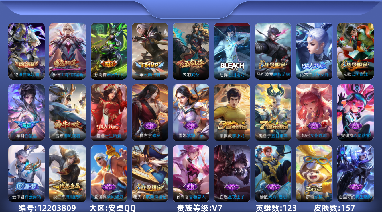 [12203809]V7 1典藏 4传说 123英雄 157皮肤 可修改实名 优质装备:银白咏叹调(倪克斯侍卫),云鹰飞将(小将军),末日机甲-孙尚香(绿蚂蚱),山海·炽霜斩(李信年限) 珍宝阁皮:蔷薇恋人,玩趣恶龙 限定皮:寅虎·展翼(孙膑年限),白晶晶,五谷丰年,武圣,御风骁将(吕布年限),李小龙,默契交锋-花木兰,一生所爱,云端筑梦师 史诗皮:石田雨龙,紫霞仙子,特工魅影,百解令(蒙犽),蒙恬荣光圣徽,猫狗日记-孙策,修罗,女仆咖啡,摇滚巨星,水果甜心,天才门将,星夜王子,心灵骇客,德古拉伯爵,暗隐猎兽者,鬼剑武藏,心灵战警,天秀·启明,地狱岩魂,纤云弄巧,繁星吟游(呼啦呼啦),缤纷独角兽,乘风破浪,逐浪之夏,金属风暴,原初追逐者,圣诞狂欢,鹰眼统帅,魅力维加斯,黎明之约,雪上飞焰,奇遇舞章,未来纪元-赵云