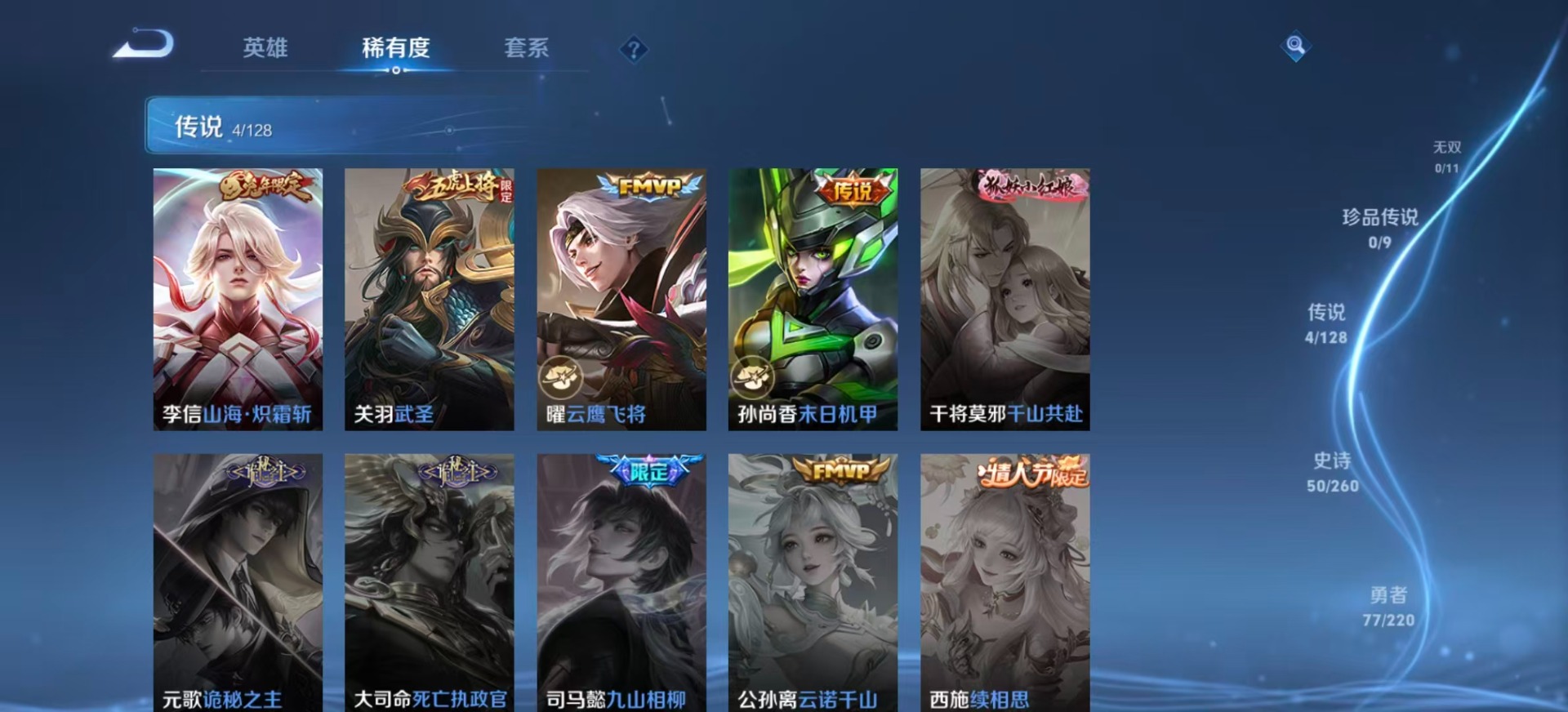 - [11689096]V10 5典藏 1珍品传说 35传说 126英雄 451皮肤 典藏英雄武则天 可修改实名 优质装备:天鹅之梦(小乔典藏),倪克斯神谕(宇宙婆娘),全息碎影(猴子典藏),银白咏叹调(倪克斯侍卫),弑枪猎影(韩信典藏),黄金狮子座,黄金射手座,冠军飞将,黄金白羊座,久胜战神,末日机甲-孙尚香(绿蚂蚱),地狱火,零号·赤焰,地狱之眼,音你心动-周瑜,时之恋人-刘备(电焊工),超时空战士-狄仁杰,山海·炽霜斩(李信年限),山海·琳琅生(小乔年限),山海·苍雷引(电光曜子),燃星之曲,艾琳觅芳踪,涂山容容 珍品传说:兔狲·蓬尾 传说皮:乘龙·淬吴钩(孙策年限),幻光神枪 珍宝阁皮:妄想食味,玩趣恶龙 限定皮:愿照·九州拓(澜年限),愿照·福禄聚(蔡文姬年限),愿照·岁时盈(虞姬年限),愿照·山河定(司空震年限),愿照·众生和(妲己年限),愿照·千秋盛(女娲年限),逐霄战戟,陌上桑,鸣野蒿,至尊宝,凤求凰(白切鸡),凤凰于飞,太华(伽罗年限),武陵仙君(小桃花),时之彼端,神威(电光马子),飞衡(韩信年限),玄嵩(庄周年限),山海·碧波行(瑶年限),无限倾心-项羽,影龙天霄,遇见飞天,无限倾心-虞姬,齐天大圣,五谷丰年,青龙志(铠年限),幽恒(沐浴露),游园惊梦,龙胆,逐梦之星,烈魂,岱宗(典韦年限),虎魄,天狼征服者,天狼绘梦者,李小龙,逐梦之影,朱雀志(守约年限),辉光之辰,大圣娶亲,引擎之心,天魔缭乱,青春决赛季,蜜橘之夏,山海·玄木吟(马可年限) 史诗皮:鸭鸭历险记-刘禅,器灵·浮梦炉,化蝶舞,灵蛊蚀心,星界战将,谪仙醉月,龙之律动,雪豹·霜爪,石田雨龙,百相守梦-周瑜,茶境仙,幻珠鲛人,怒海争锋,撼地雄心,破空之剑,蒙犽顽岩魄,埋骨钱,芈月浮光幕影,琥珀纪元伽罗,蔬乡物语(鲁班七号),百相守梦-百里守约,百相守梦-黄忠,织梦人,紫霞仙子,苍穹之光,电玩小子(小书包),白龙吟,黄金分割率,特工魅影,千年之狐,江河有灵,雪夜绮愿(周瑜),魅语,百解令(蒙犽),高渐离燃音魔法,蒙恬荣光圣徽,无限星赏官,冰冠公主,青蛇,偶像歌手,晚萤,暗夜猫娘,龙骑士(小龙虾),末日机甲-吕布,猫狗日记-孙策,猫狗日记-大乔,时之恋人-孙尚香,乱世虎臣,节奏热浪,修罗,女仆咖啡,摇滚巨星,水果甜心,绅士熊喵,天才门将,星夜王子,心灵骇客,功夫厨神,德古拉伯爵,暗隐猎兽者,幽灵船长,鬼剑武藏