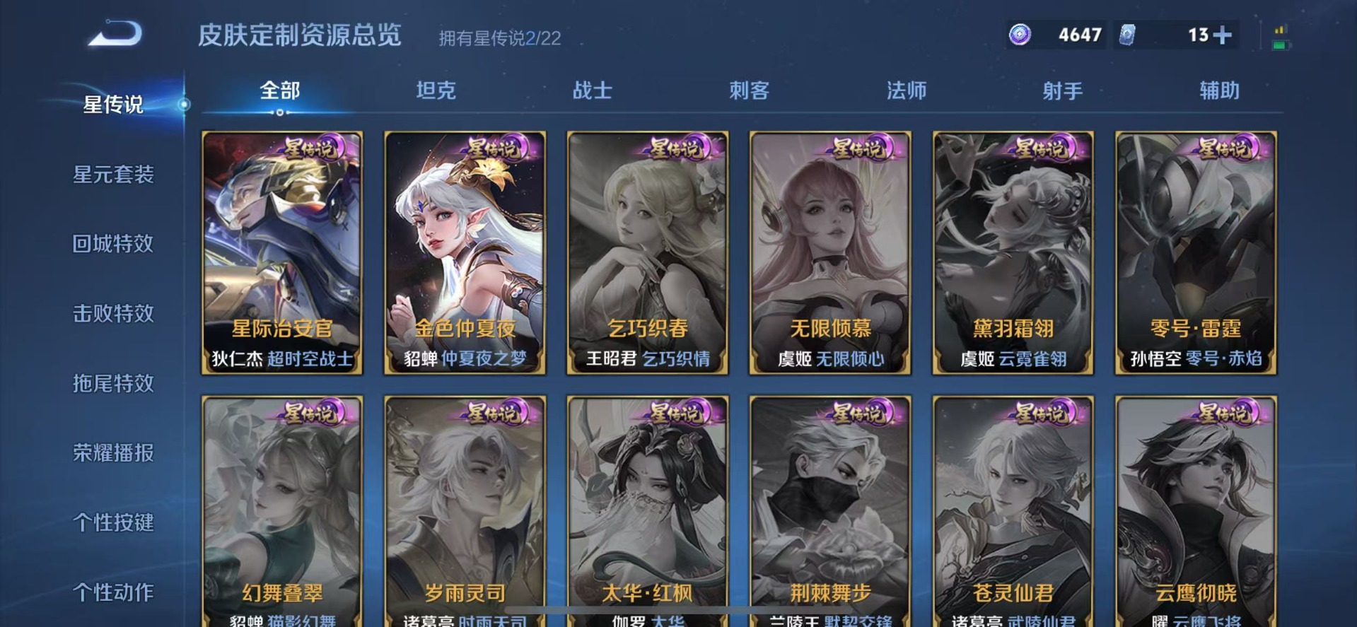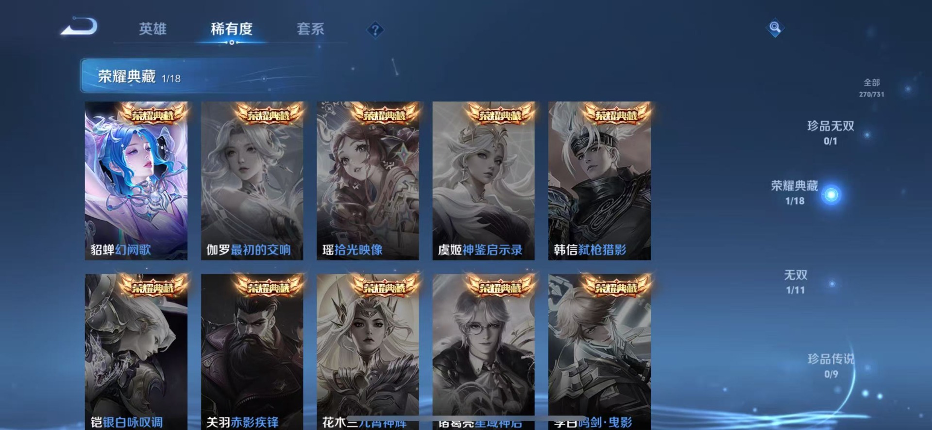 廉颇寅虎·御盾,典韦岱宗,诸葛亮时雨天司,公孙离玉兔公主,司空震愿照·山河定,裴擒虎李小龙,李白诗剑行,马可波罗山海·玄木吟,马可波罗深海之息,桑启鸣野蒿,孙悟空孙行者,百里玄策白虎志,韩信傲雪梅枪,澜愿照·九州拓