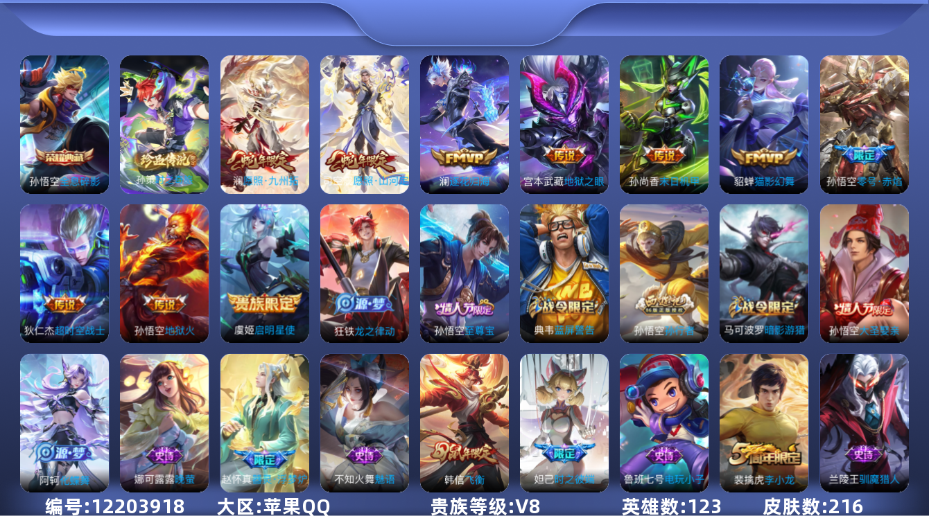 [12203918]V8 1典藏 1珍品传说 10传说 123英雄 216皮肤 可修改实名 优质装备:全息碎影(猴子典藏),猫影幻舞,末日机甲-孙尚香(绿蚂蚱),地狱火,零号·赤焰,地狱之眼,超时空战士-狄仁杰,澜逐花归海 珍品传说:时之奇旅-孙策 珍宝阁皮:玩趣恶龙 限定皮:愿照·九州拓(澜年限),愿照·山河定(司空震年限),至尊宝,时之彼端,飞衡(韩信年限),高山流水,梁祝,李小龙,如梦令-后羿,孙行者,大圣娶亲 史诗皮:器灵·浮梦炉,化蝶舞,龙之律动,星界战将,奇遇星旅,苍穹之光,电玩小子(小书包),黄金分割率,特工魅影,冰冠公主,末日机甲-莱西奥,魅语,晚萤,偶像歌手,暗夜猫娘,末日机甲-吕布,猫狗日记-孙策,节奏热浪,摇滚巨星,水果甜心,星夜王子,功夫厨神,德古拉伯爵,暗隐猎兽者,幽灵船长,鬼剑武藏,舞动绿茵,缤纷独角兽,乘风破浪,逐浪之夏,水晶猎龙者,曙光守护者,金属风暴,原初追逐者,圣诞狂欢,鹰眼统帅,魅力维加斯,未来纪元-赵云