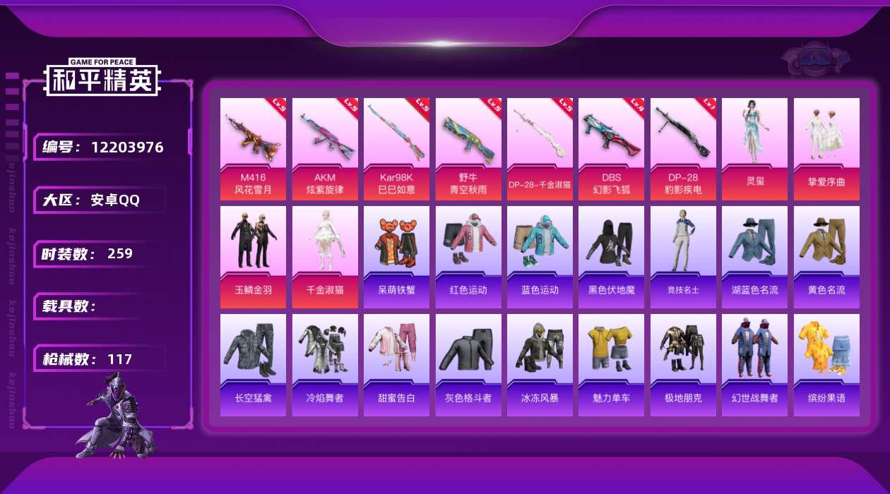 [12203976]4粉装 7特效枪 5印记 可二次 可修改实名 优质装备:AKM炫紫旋律,M416风花雪月,野牛-青空秋雨,DP-28-千金淑猫,千金淑猫,DBS-幻影飞狐,灵玺,Kar98K-巳巳如意 热门装扮:挚爱序曲,玉鳞金羽,呆萌铁蟹 稀有枪皮:DP-28-豹影疾电 五级特效枪:五级DP-28-千金淑猫,五级Kar98K-巳巳如意,五级Kar98K-伏魔团,五级野牛-青空秋雨,五级M416-风花雪月 四级特效枪:四级DBS-幻影飞狐 一级特效枪:一级DP-28-豹影疾电 紫色装扮:极速光影,SS31特训套装,SS30特训套装,SS23特训,SS33特训套装,田园牧歌,轻风白浪,SS22特训,莱茵河畔,幻世战舞者,冷焰舞者,SS21特训,覆海蛟龙,甜心亚梦,虚音幻奏,猎梦纪元,SS20特训,暖心橘喵,娇憨猪猪,萌趣咩咩,SS18特训,英勇保护者,飞行日记,魅力单车,麻辣教官,黄色名流,黑色伏地魔,龟仙人,冰河战士,龙魂突击队,蝶变,长空猛禽,湖蓝色名流,灰色格斗者,牛气冲天,牛气满满,探宝勇士,极地朋克,柠萌假日,红色运动,缤纷果语,蓝色运动,甜蜜告白,破蛋小黄鸡,SS29特训,SS28特训,鱼渊荷华,玉兔迎春,燕燕于飞,巳巳如意,青团波波,糖糖葫芦,竞技名士,异域银装,SS24特训(SS24特训套装),元气发射,SS27特训,纯白誓言,大橘大利,紫幽梦,SS32特训服(SS32特训套装),蓝冰羽,粉恋花,恋语绒绒,冰冻风暴 优质战备:绯穹魔姬降落伞,荧海星豚降落伞,旋转彩虹降落伞,彩虹甜喵降落伞