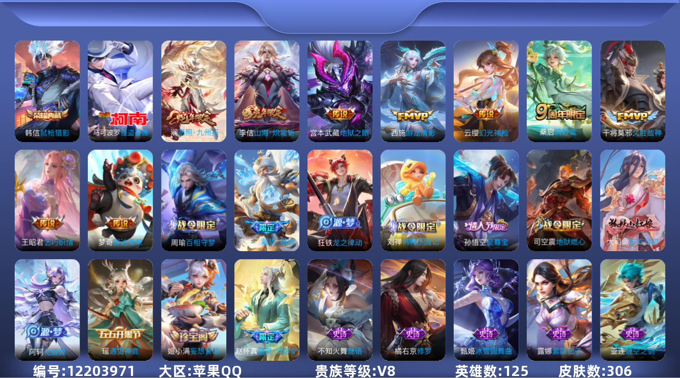[12203971]V8 1典藏 1珍品传说 9传说 125英雄 306皮肤 可修改实名 优质装备:弑枪猎影(韩信典藏),怪盗基德,久胜战神,地狱之眼,胖达荣荣,乞巧织情,游龙清影(小青龙),山海·炽霜斩(李信年限) 传说皮:幻光神枪 珍宝阁皮:妄想食味,万物之道,玩趣恶龙 限定皮:愿照·九州拓(澜年限),逐霄战戟,陌上桑,鸣野蒿,至尊宝,高山流水,五谷丰年 史诗皮:鸭鸭历险记-刘禅,器灵·浮梦炉,绮世丹青,化蝶舞,龙之律动,星界战将,藏狐·褐绒,百相守梦-周瑜,茶境仙,谪仙醉月,星界特工,炽弈燎原,破空之剑,战舞者,东方月初,蒙犽顽岩魄,芈月浮光幕影,决胜骁骑,上官婉儿群星魔术团,蔬乡物语(鲁班七号),百相守梦-百里守约,遇见神鹿,紫霞仙子,黄金分割率,特工魅影,蒙恬荣光圣徽,魅语,电玩·爆裂旋风,偶像歌手,末日机甲-吕布,猫狗日记-大乔,乱世虎臣,节奏热浪,修罗,女仆咖啡,摇滚巨星,水果甜心,绅士熊喵,天才门将,星夜王子,心灵骇客,功夫厨神,暗隐猎兽者,幽灵船长,鬼剑武藏,暗渊魔法,乐园奇幻夜,天秀·启明,舞动绿茵,拒霜思,乘风破浪,逐浪之夏,月团寄思,水晶猎龙者,曙光守护者,箭羽风息,金属风暴,原初追逐者,圣诞狂欢,圣诞恋歌,鹰眼统帅,暗夜贵公子,魅力维加斯,赏金猎手,无心