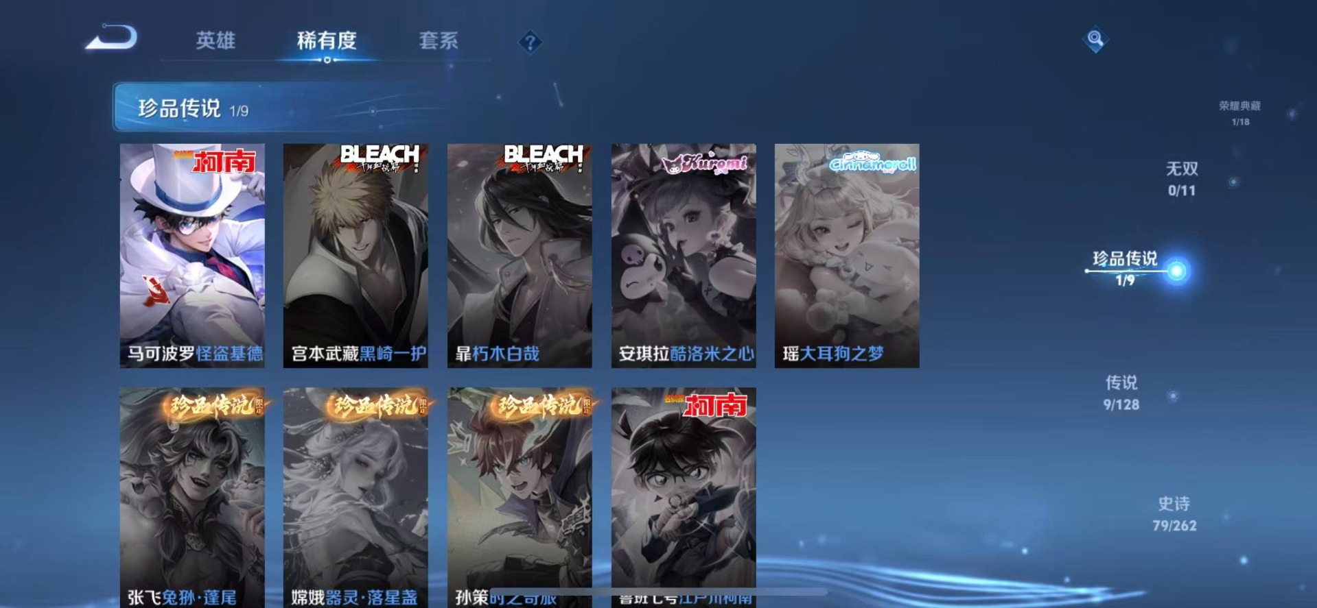 老夫子醍醐杖,沈梦溪大漠名商,苏烈千军破阵,达摩沙漠行僧,项羽苍威无极,镜青焰无极,兰陵王金庭之子,裴擒虎擒涛扼浪,鲁班大师探海日志,鬼谷子原初探秘者,张良古海寻踪,桑启海盐诗旅,狄仁杰万华元夜,程咬金演武夺筹,李元芳云中旅人,钟馗驱傩正仪