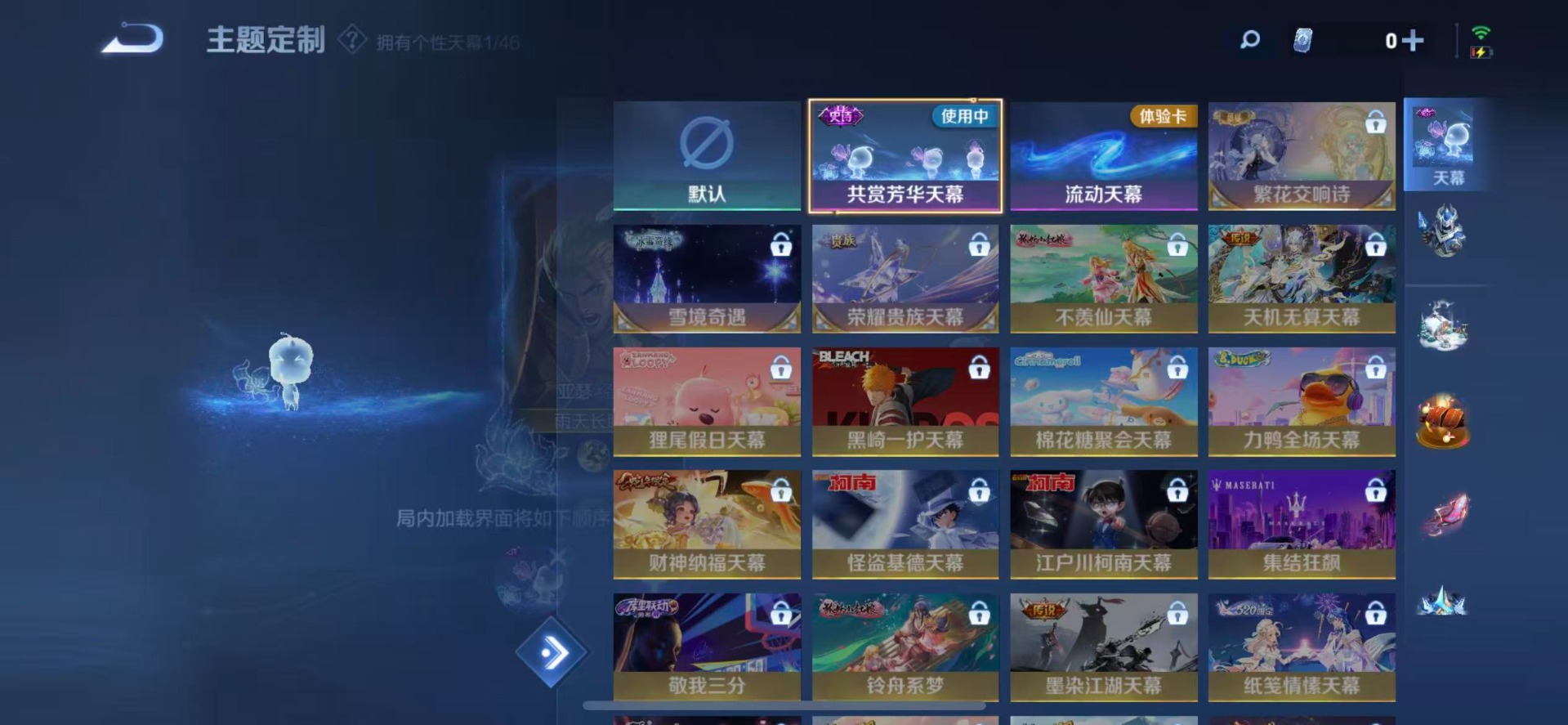 大乔猫狗日记,夏侯惇乘风破浪,阿轲节奏热浪,铠曙光守护者,曹操幽灵船长,伽罗箭羽风息,不知火舞魅语,赵怀真器灵·浮梦炉,吕布圣诞狂欢,露娜紫霞仙子,吕布末日机甲,诸葛亮黄金分割率,刘禅电玩·爆裂旋风,司马懿暗渊魔法,刘禅天才门将,刘禅绅士熊喵,宫本武藏鬼剑武藏,兰陵王暗隐猎兽者,貂蝉圣诞恋歌,李白谪仙醉月,花木兰水晶猎龙者,上官婉儿群星魔术团,安琪拉心灵骇客,杨戬天秀·启明,白起星夜王子,狄仁杰绮世丹青,嬴政摇滚巨星,嬴政暗夜贵公子,程咬金功夫厨神,百里玄策原初追逐者,百里守约特工魅影,李元芳逐浪之夏,墨子金属风暴,蔡文姬舞动绿茵,瑶遇见神鹿,澜赏金猎手,王昭君偶像歌手,嫦娥拒霜思,钟馗乐园奇幻夜,橘右京修罗,关羽决胜骁骑
