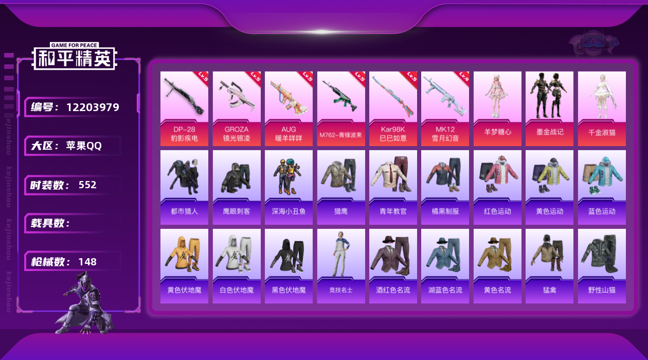 - PX_2066518- 苹果手Q-12王牌印记-16粉装-6特效枪-4载具-74203热力值-165套装-187枪皮-2卓越印记-0传奇印记 【16粉装】,梦幻火箭,宝贝奶油派,天使彩虹糖,蝶舞迷情,白勺歌姬,光极星,幻影飞狐,复仇流浪者,天禅智恒,霁雪冰心,青空秋雨,天之羽翼,绚金战神,未来歌姬,创世·救赎,呆萌星弥 【6特效枪】AKM-绿萝繁花-5级 SCAR-L-青春物语-7级 M416-心