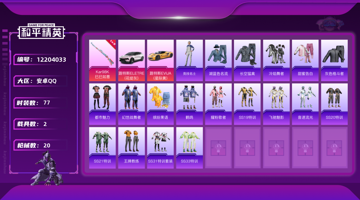 [12204033]1特效枪 2载具 可二次 可修改实名 连体王者 优质装备:路特斯ELETRE(花绽灰),路特斯EVIJA(星际黄),Kar98K-巳巳如意 五级特效枪:五级Kar98K-巳巳如意 紫色装扮:SS21特训,SS31特训套装,冷焰舞者,SS33特训套装,SS20特训,飞驰魅影,音速流光,SS19特训,都市魅力,长空猛禽,缤纷果语,鹤鸣,幻世战舞者,湖蓝色名流,甜蜜告白,王牌教练,灰色格斗者,竞技名士,耀粉歌者 优质战备:青空秋雨降落伞
