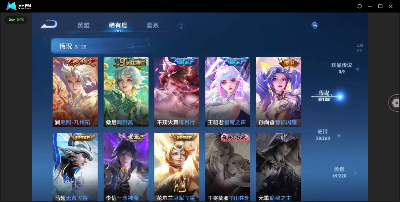 - [11626942]V8 3典藏 25传说 125英雄 361皮肤 可修改实名 荣耀水晶:拾光映像(瑶典藏),鸣剑·曳影,弑枪猎影(韩信典藏) 传说皮:李逍遥,黄金射手座,地狱火,仲夏夜之梦(大飞蛾),末日机甲-孙尚香(绿蚂蚱),云霓雀翎,一念神魔,久胜战神,云鹰飞将(小将军),炽阳神光,超时空战士-狄仁杰,浮生妄,记忆之芯(机甲兔) 珍宝阁皮:优雅恋人,女武神,玩趣恶龙 限定皮:愿照·九州拓(澜年限),愿照·岁时盈(虞姬年限),愿照·山河定(司空震年限),愿照·众生和(妲己年限),逐霄战戟,鸣野蒿,至尊宝,白虎志(电光耗子),凤求凰(白切鸡),傲雪梅枪,前尘镜,时雨天司(水龙头),神威(电光马子),遇见飞天,高山流水,齐天大圣,五谷丰年,冰锋战神,游园惊梦,梁祝,御风骁将(吕布年限),李小龙,如梦令-后羿,默契交锋-兰陵王,默契交锋-花木兰,一生所爱,大圣娶亲,青春决赛季,冰霜恋舞曲,蜜橘之夏,玉兔公主,山海·玄木吟(马可年限) 史诗皮:茶境仙,器灵·浮梦炉,狼魂孤将,鸭鸭历险记-刘禅,蒙犽顽岩魄,怒海争锋,化蝶舞,幻珠鲛人,紫霞仙子,电玩小子(小书包),白龙吟,黄金分割率,特工魅影,千年之狐,江河有灵,蒙恬荣光圣徽,冰冠公主,偶像歌手,晚萤,无限星赏官,魅语,白蛇,电玩·爆裂旋风,暗夜猫娘,龙骑士(小龙虾),末日机甲-吕布,猫狗日记-孙策,猫狗日记-大乔,乱世虎臣,节奏热浪,修罗,女仆咖啡,摇滚巨星,水果甜心,绅士熊喵,天才门将,星夜王子,心灵骇客,功夫厨神,德古拉伯爵,暗隐猎兽者,幽灵船长,鬼剑武藏,心灵战警,舞动绿茵,地狱岩魂,纤云弄巧,繁星吟游(呼啦呼啦),拒霜思,缤纷独角兽,乘风破浪,逐浪之夏,水晶猎龙者,曙光守护者,箭羽风息,金属风暴,原初追逐者,圣诞狂欢,圣诞恋歌,鹰眼统帅,暗夜贵公子,魅力维加斯,黎明之约,赏金猎手,奇遇舞章,无心,未来纪元-赵云