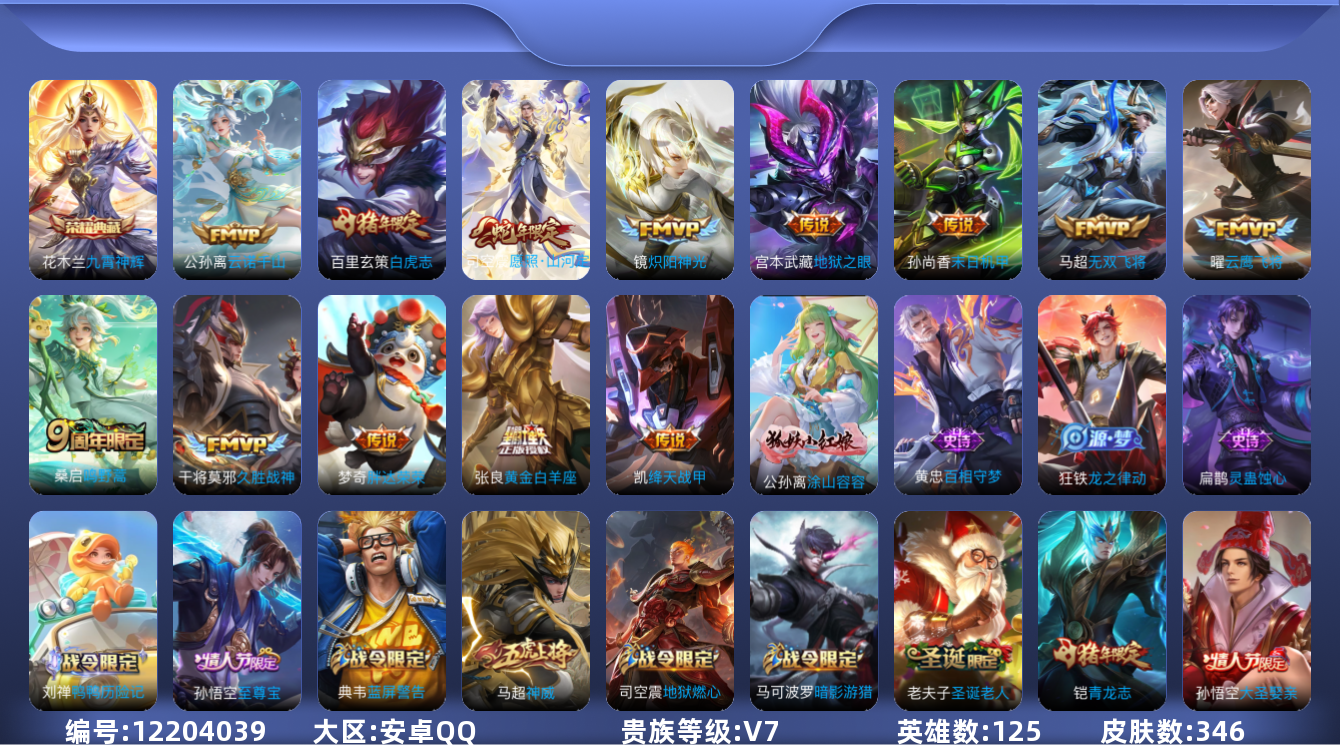 - [11883497]V7 12传说 124英雄 169皮肤 可修改实名 优质装备:云鹰飞将(小将军),一念神魔,末日机甲-孙尚香(绿蚂蚱),地狱之眼,无双飞将,惊梅引 传说皮:乘龙·铭钟鼎(赵云年限) 珍宝阁皮:蔷薇恋人 限定皮:愿照·岁时盈(虞姬年限),神威(电光马子),高山流水,齐天大圣,怒海麟威,五谷丰年,青龙志(铠年限),梁祝,李小龙,孙行者,寅虎·赤拳(老虎年限),深海之息(深海大菠萝) 史诗皮:石田雨龙,琥珀纪元伽罗,紫霞仙子,白龙吟,特工魅影,永昼,江河有灵,鹤归松栖(赵怀真),高渐离燃音魔法,蒙恬荣光圣徽,偶像歌手,白蛇,节奏热浪,修罗,水果甜心,星夜王子,暗隐猎兽者,鬼剑武藏,地狱岩魂,纤云弄巧,逐浪之夏,水晶猎龙者,金属风暴,原初追逐者,圣诞狂欢,圣诞恋歌,鹰眼统帅,魅力维加斯,黎明之约,赏金猎手,无心,未来纪元-赵云