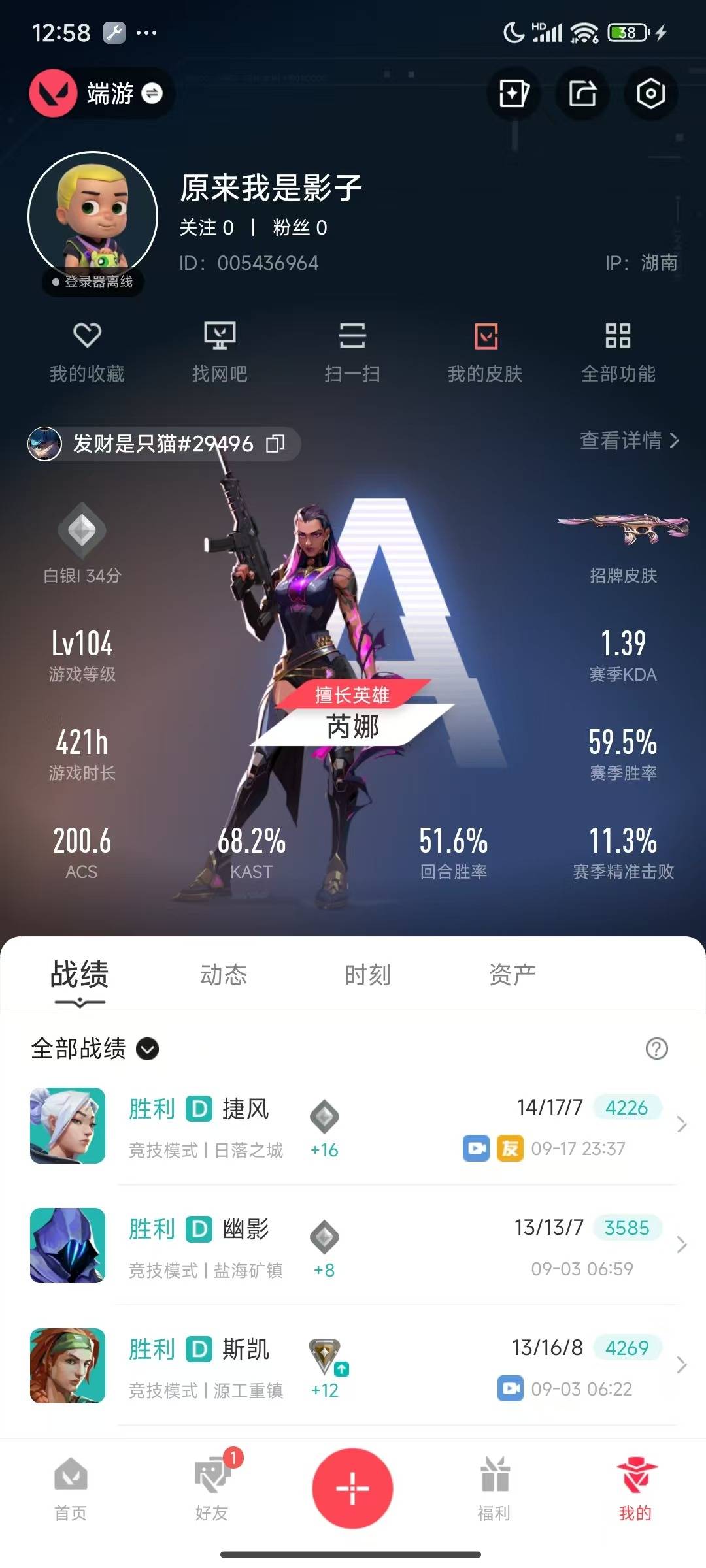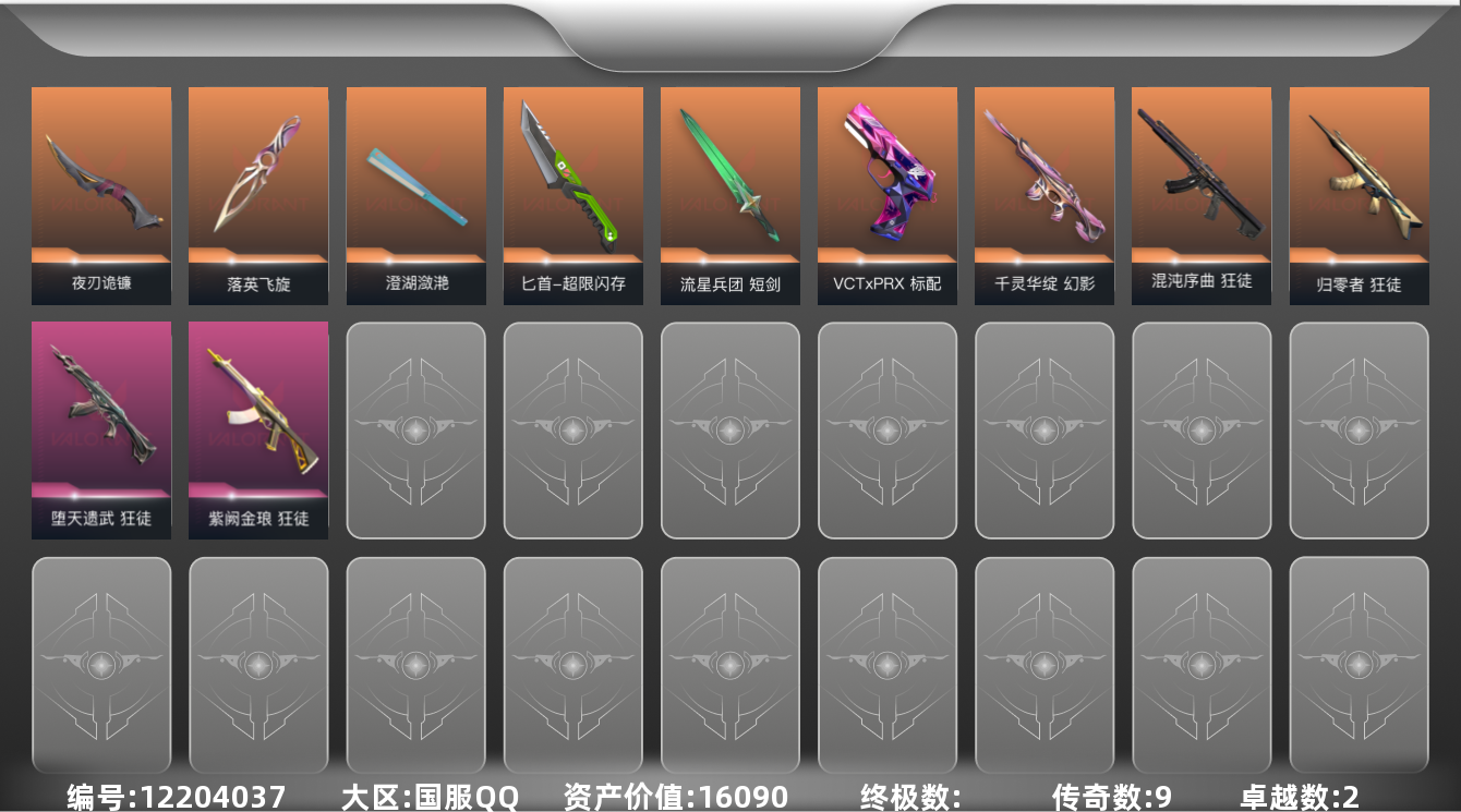 [12204037]9橙皮 2紫皮 38皮肤 27英雄 78卡面 470已用源晶 白银 优质装备:狂徒-归零者,幻影-千灵华绽,狂徒-混沌序曲,狂徒-紫阙金琅,澄湖潋滟,落英飞旋,夜刃诡镰,匕首-超限闪存 佩枪皮肤:标配-VCTxPRX 步枪皮肤:狂徒-堕天遗武 近战武器皮肤:短剑-流星兵团