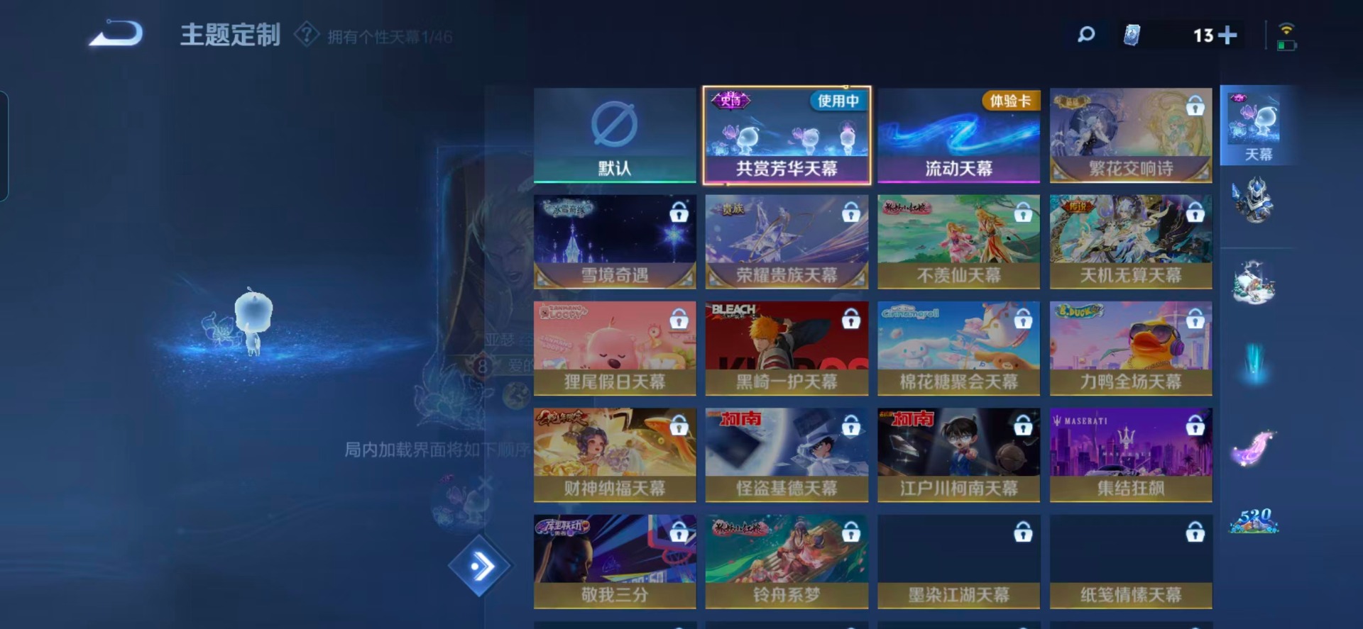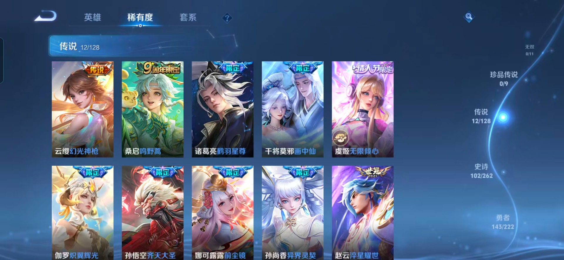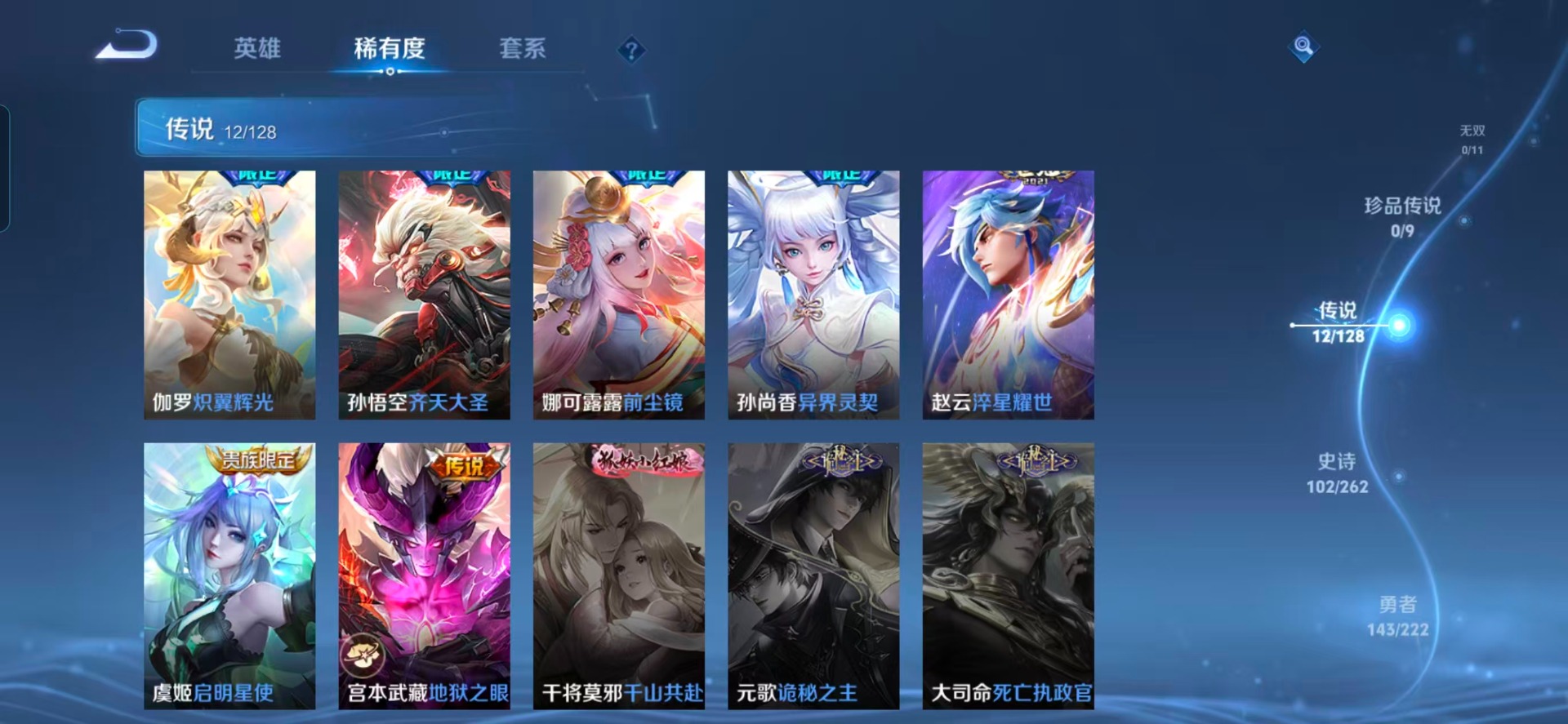 赵云龙胆,孙尚香异界灵契,后羿如梦令,公孙离玉兔公主,裴擒虎天狼狩猎者,上官婉儿梁祝,安琪拉魔法小厨娘,马可波罗山海·玄木吟,桑启鸣野蒿,孙悟空孙行者,孙悟空至尊宝,妲己时之奇旅,娜可露露前尘镜,关羽冰锋战神