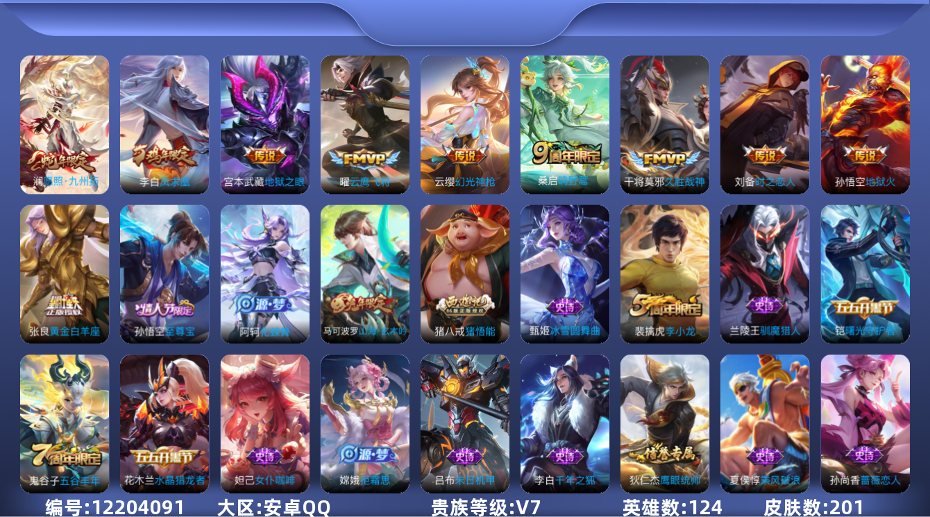 [12204091]V7 10传说 124英雄 201皮肤 可修改实名 优质装备:云鹰飞将(小将军),黄金白羊座,久胜战神,地狱火,地狱之眼,时之恋人-刘备(电焊工) 传说皮:幻光神枪 珍宝阁皮:蔷薇恋人,玩趣恶龙 限定皮:愿照·九州拓(澜年限),鸣野蒿,至尊宝,凤求凰(白切鸡),五谷丰年,游园惊梦,梁祝,李小龙,猪悟能,山海·玄木吟(马可年限) 史诗皮:化蝶舞,蒙犽顽岩魄,苍穹之光,特工魅影,千年之狐,江河有灵,末日机甲-吕布,节奏热浪,女仆咖啡,摇滚巨星,水果甜心,绅士熊喵,星夜王子,暗隐猎兽者,鬼剑武藏,地狱岩魂,拒霜思,缤纷独角兽,乘风破浪,逐浪之夏,水晶猎龙者,曙光守护者,金属风暴,鹰眼统帅,魅力维加斯,未来纪元-赵云