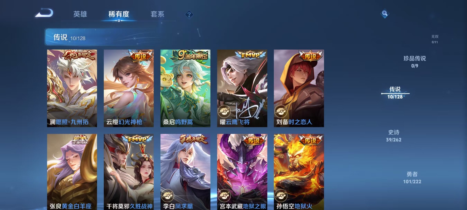 夏侯惇朔风刀,老夫子醍醐杖,沈梦溪大漠名商,苏烈千军破阵,典韦穷奇,达摩沙漠行僧,鲁班七号狮舞东方,兰陵王金庭之子,裴擒虎擒涛扼浪,鲁班大师探海日志,明世隐疑决卦,鬼谷子原初探秘者,张良古海寻踪,桑启海盐诗旅,狄仁杰万华元夜,程咬金演武夺筹,李元芳云中旅人,弈星混沌棋,钟馗神迹守卫,钟馗驱傩正仪,狂铁御狮