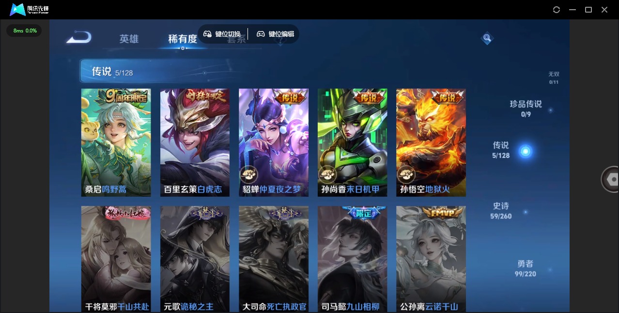 - [11866497]V6 1珍品传说 3传说 123英雄 180皮肤 可修改实名 优质装备:黑崎一护,炽阳神光,涂山容容 珍宝阁皮:妄想食味,玩趣恶龙 限定皮:逐霄战戟,鸣野蒿,至尊宝,凤求凰(白切鸡),凤凰于飞,傲雪梅枪,遇见飞天,五谷丰年,游园惊梦,梁祝,李小龙,大圣娶亲 史诗皮:赞萌露比,石田雨龙,东方月初,蒙犽顽岩魄,遇见神鹿,紫霞仙子,特工魅影,千年之狐,江河有灵,暗夜猫娘,猫狗日记-孙策,女仆咖啡,摇滚巨星,水果甜心,天才门将,心灵骇客,幽灵船长,鬼剑武藏,心灵战警,地狱岩魂,纤云弄巧,缤纷独角兽,乘风破浪,逐浪之夏,水晶猎龙者,金属风暴,鹰眼统帅,魅力维加斯,无心,未来纪元-赵云