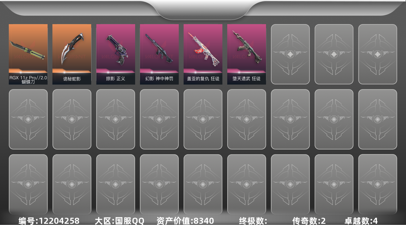 [12204258]2橙皮 4紫皮 17皮肤 13英雄 33卡面 250已用源晶 未定级 优质装备:狂徒-盖亚的复仇,正义-掠影,RGX 11z Pro//2.0 蝴蝶刀,诡秘蛇影 步枪皮肤:幻影-神中神罚,狂徒-堕天遗武