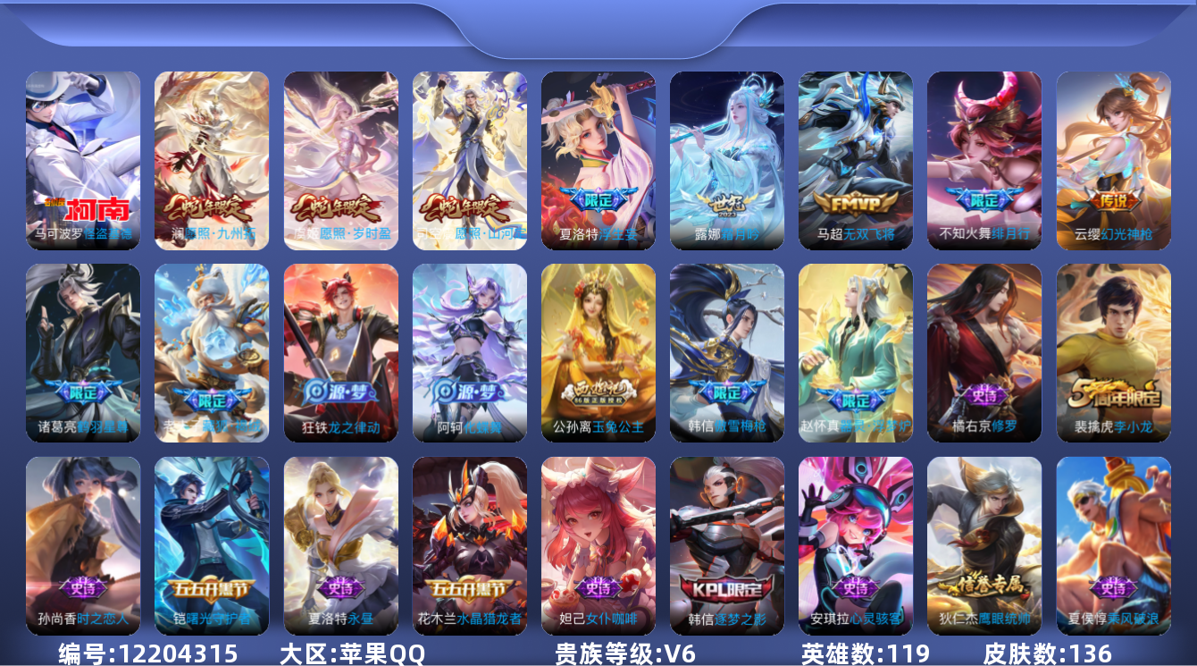 [12204315]V6 1珍品传说 9传说 119英雄 136皮肤 可修改实名 优质装备:怪盗基德,无双飞将,浮生妄,鹤羽星尊,霜月吟 传说皮:幻光神枪 珍宝阁皮:万物之道,蔷薇恋人 限定皮:愿照·九州拓(澜年限),愿照·岁时盈(虞姬年限),愿照·山河定(司空震年限),傲雪梅枪,绯月行,高山流水,李小龙,逐梦之影,玉兔公主 史诗皮:器灵·浮梦炉,化蝶舞,龙之律动,藏狐·褐绒,茶境仙,芈月浮光幕影,黄金分割率,特工魅影,永昼,江河有灵,百解令(蒙犽),冰冠公主,猫狗日记-孙策,时之恋人-孙尚香,乱世虎臣,节奏热浪,修罗,女仆咖啡,水果甜心,天才门将,星夜王子,心灵骇客,暗隐猎兽者,乘风破浪,逐浪之夏,水晶猎龙者,曙光守护者,金属风暴,圣诞狂欢,圣诞恋歌,鹰眼统帅,魅力维加斯,黎明之约