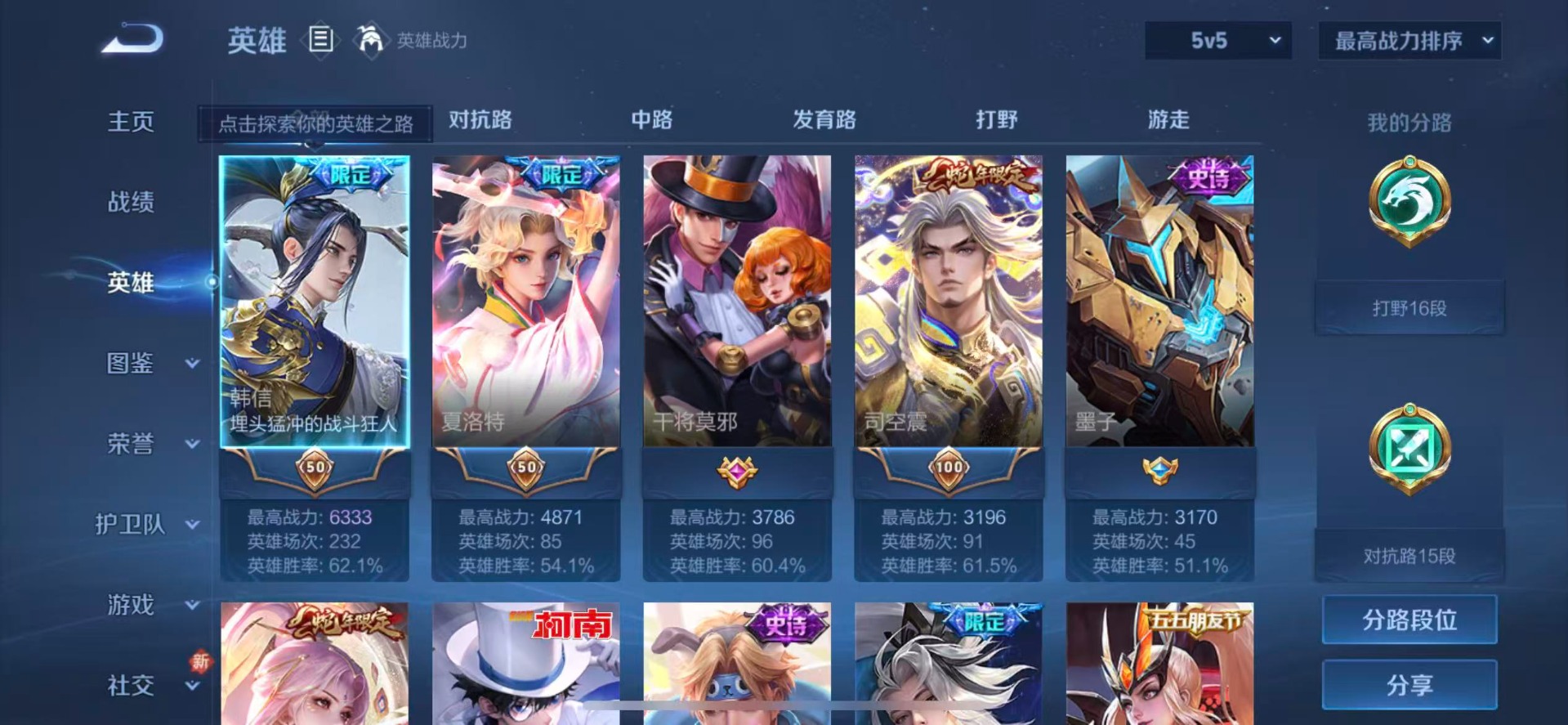 - PX_2023145-贵族等级: V7 英雄数: 123 皮肤数: 181 荣耀水晶: 无限飓风号,全息碎影 传说皮: 炽阳神光,一念神魔,地狱火,澜逐花归海 限定皮: 李小龙,游园惊梦,御风骁将,云端筑梦师,白晶晶,天魔缭乱,天狼运算者,高山流水,五谷丰年,诗剑行
