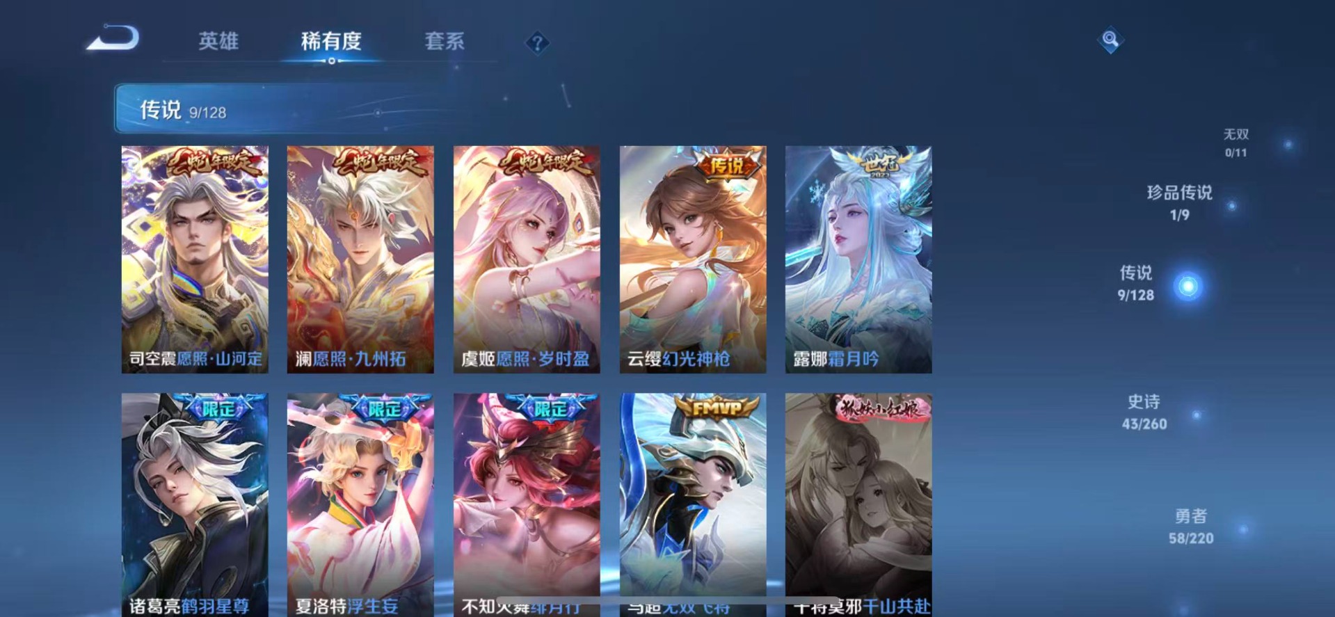 公孙离玉兔公主,司空震愿照·山河定,裴擒虎李小龙,不知火舞绯月行,韩信傲雪梅枪,韩信逐梦之影,澜愿照·九州拓,虞姬愿照·岁时盈