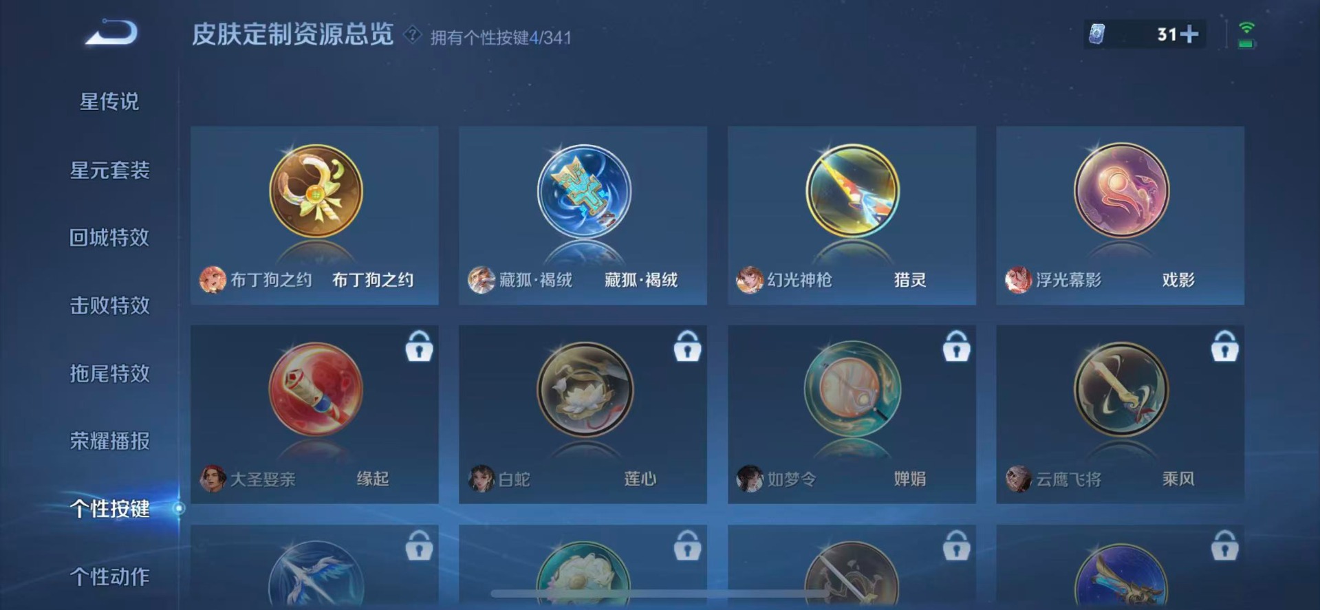 兰陵王暗隐猎兽者,貂蝉圣诞恋歌,夏侯惇乘风破浪,阿轲节奏热浪,花木兰水晶猎龙者,夏洛特永昼,安琪拉心灵骇客,蒙犽百解令,铠曙光守护者,白起星夜王子,孙尚香时之恋人,孙策猫狗日记,雅典娜冰冠公主,赵怀真器灵·浮梦炉,雅典娜黎明之约,李元芳逐浪之夏,百里守约特工魅影,墨子金属风暴,吕布圣诞狂欢,诸葛亮黄金分割率,刘禅天才门将,橘右京修罗