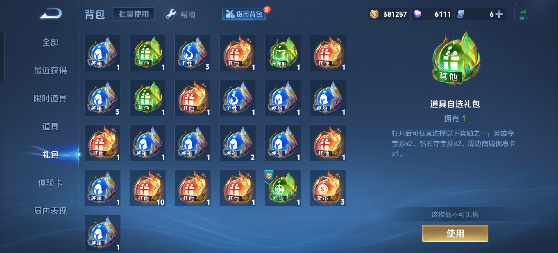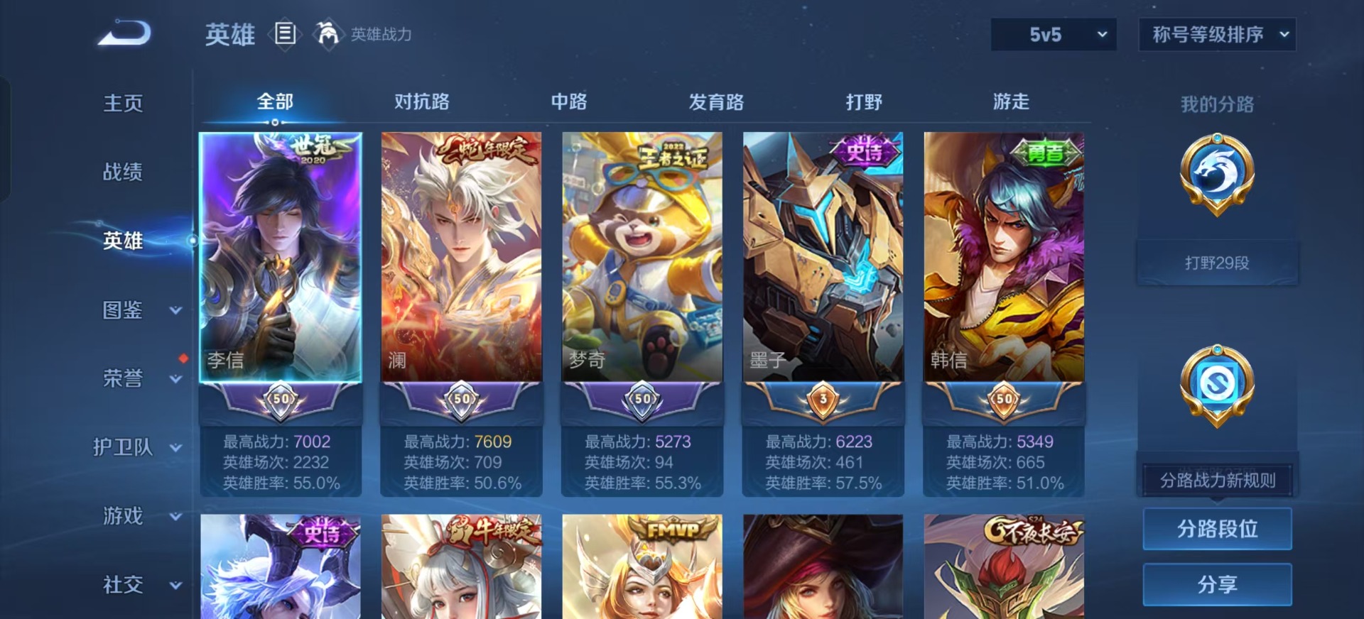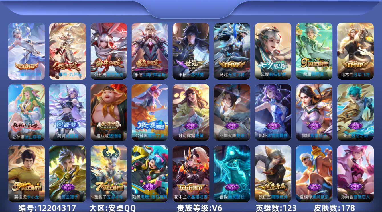 [12204317]实名: 可修改 贵族等级: V6 英雄数: 123 皮肤数: 178 荣耀水晶: 最初的交响 传说皮: 冠军飞将,一念神魔,无双飞将,山海·炽霜斩,鹤归松栖(云缨) 限定皮: 李小龙,祈雪灵祝,蜜橘之夏,高山流水,猪悟能,五谷丰年,鸣野蒿,愿照·九州拓
