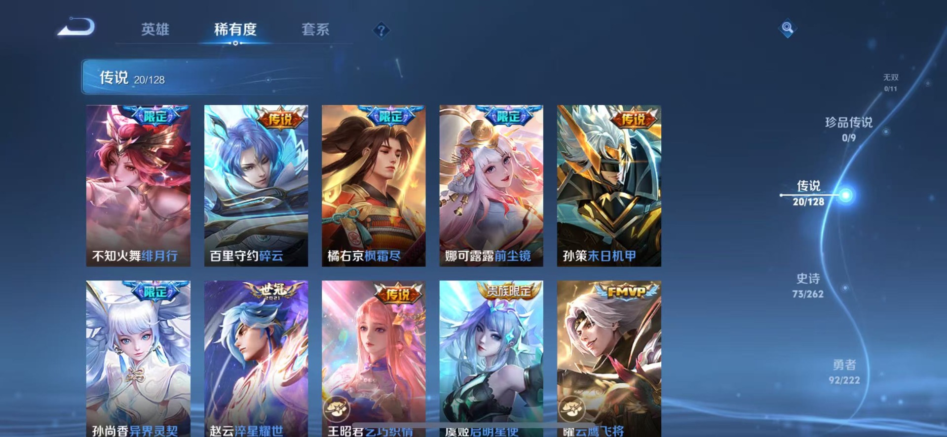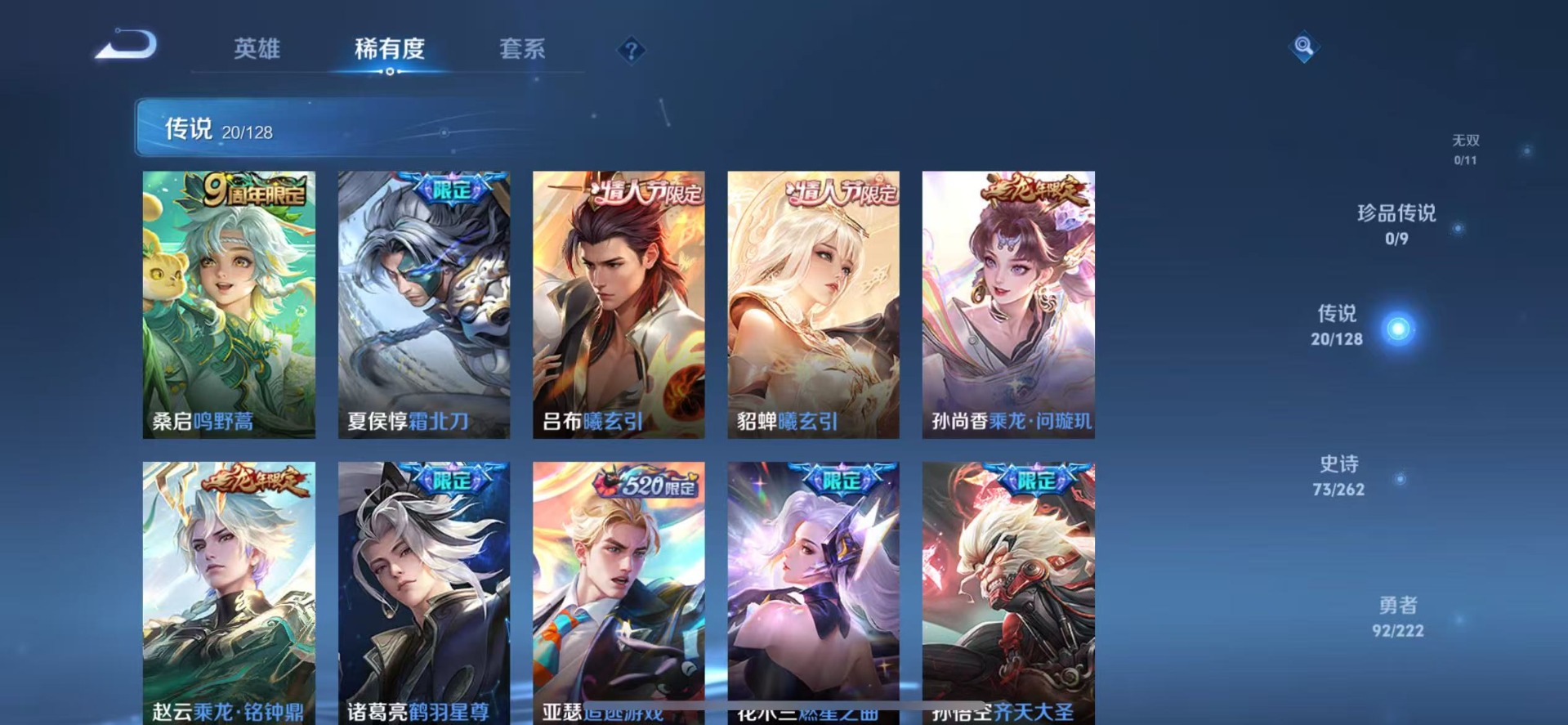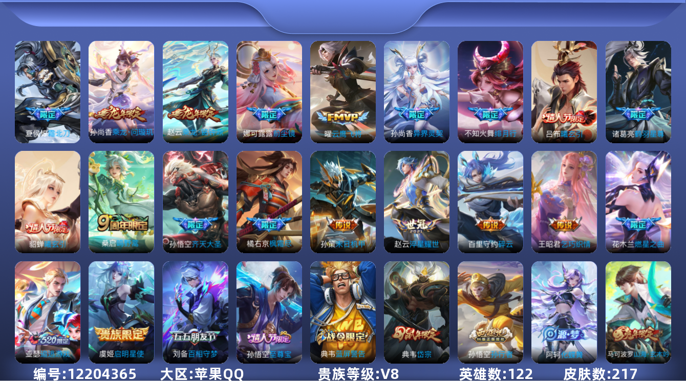 [12204365]V8 20传说 122英雄 217皮肤 可修改实名 优质装备:云鹰飞将(小将军),乞巧织情,淬星耀世,末日机甲-孙策,碎云,燃星之曲,追逃游戏(亚瑟),鹤羽星尊 传说皮:乘龙·问璇玑(孙尚香年限),乘龙·铭钟鼎(赵云年限),貂蝉曦玄引,吕布曦玄引 珍宝阁皮:妄想食味,玩趣恶龙 限定皮:鸣野蒿,夏侯惇霜北刀,至尊宝,异界灵契(白毛香),傲雪梅枪,前尘镜,绯月行,白晶晶,高山流水,齐天大圣,五谷丰年,游园惊梦,岱宗(典韦年限),李小龙,朱雀志(守约年限),孙行者,百木心枪,枫霜尽,时之奇旅-妲己,山海·玄木吟(马可年限) 史诗皮:化蝶舞,破空之剑,战舞者,怒海争锋,蔬乡物语(鲁班七号),电玩小子(小书包),永昼,冰冠公主,匿光侦查者,江河有灵,百解令(蒙犽),高渐离燃音魔法,蒙恬荣光圣徽,偶像歌手,百相守梦(刘备),末日机甲-吕布,猫狗日记-孙策,节奏热浪,女仆咖啡,水果甜心,天才门将,星夜王子,功夫厨神,德古拉伯爵,暗隐猎兽者,幽灵船长,鬼剑武藏,心灵战警,诗语江南,纤云弄巧,拒霜思,缤纷独角兽,乘风破浪,逐浪之夏,曙光守护者,唤灵魅影,金属风暴,原初追逐者,圣诞狂欢,圣诞恋歌,鹰眼统帅,魅力维加斯,黎明之约,雪上飞焰,赏金猎手,奇遇舞章,无心,未来纪元-赵云