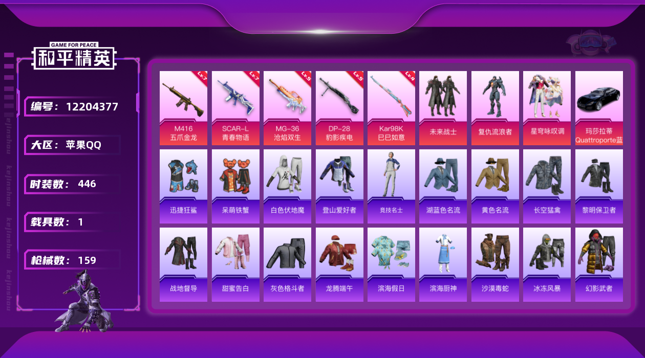 - PX_2095518- 苹果手Q-4王牌印记-2粉装-4特效枪-1载具-43261热力值-104套装-126枪皮-0卓越印记-0传奇印记 【2粉装】,新星烈龙,蓝莓炮弹 【4特效枪】M416-五爪金龙-1级 M416-至情至圣-9级 SKS-碧影闪光-4级 Vector-环太平洋-4级 【2稀有紫装】,雪山精英,龟仙人, 【1稀有载具】,玛莎拉蒂Quattroporte(夜幕蓝), 【104稀有