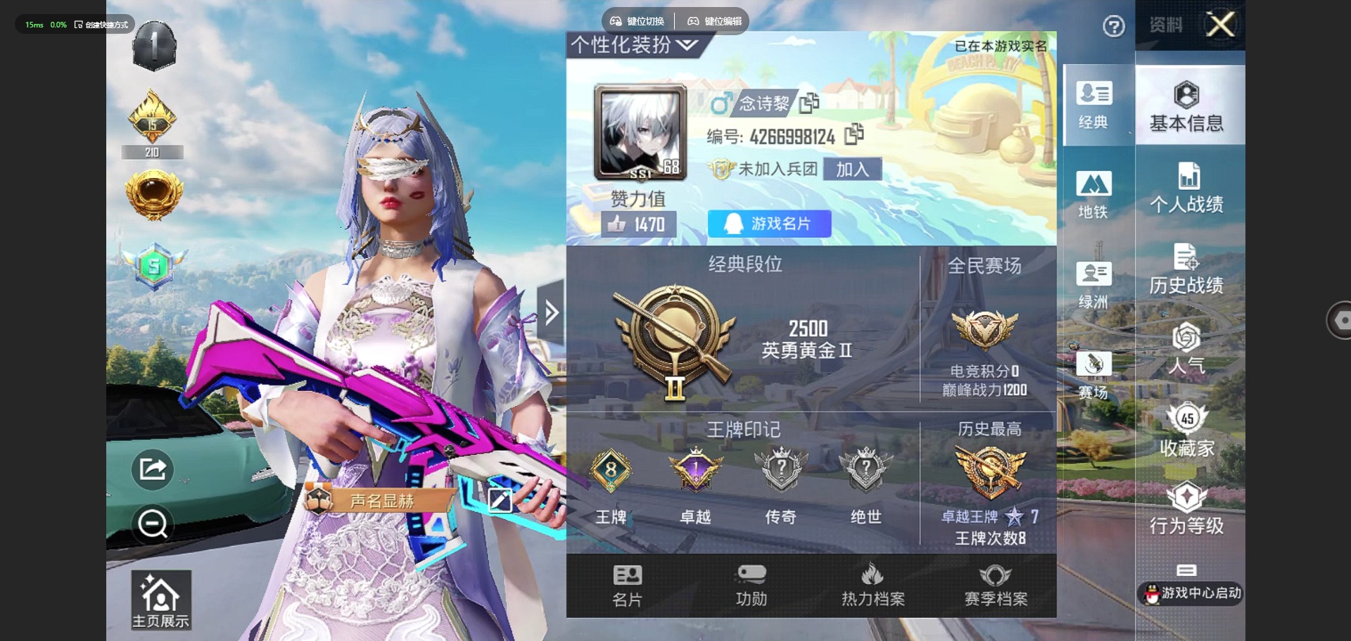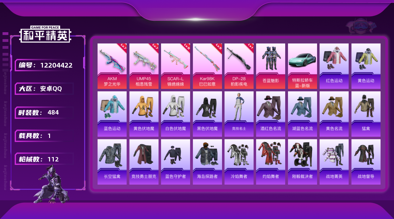 [12204422]1粉装 5特效枪 1载具 8印记 可二次 可修改实名 优质装备:特斯拉Roadster(水滴蓝),苍蓝魅影,UMP45相思残雪(UMP45-相思残雪),AKM梦之光华,SCAR-L-锦绣绵绵,七级AKM-梦之光华,七级UMP45-相思残雪,Kar98K-巳巳如意 稀有枪皮:DP-28-豹影疾电 五级特效枪:五级Kar98K-巳巳如意,五级SCAR-L-锦绣绵绵 一级特效枪:一级DP-28-豹影疾电 紫色装扮:SS22特训,SS21特训,SS31特训套装,SS2特训,SS3特训,SS4特训,人气偶像,决胜时刻,冷焰舞者,刚毅裁决者,北国孤狼,SS30特训套装,SS33特训套装,SS20特训,青春冒险家,潮流游乐家,SS15特训,暗夜傀儡,SS16特训,银白舞王,SS13特训,星梦畅游,SS14特训,萌趣颜团子,特种颜团子,微雨春柳,暖风夏荷,飞驰魅影,音速流光,SS19特训,吉莉礼服,SS17特训,SS18特训,阳光火鸡,都市漫游者,都市魅力,酒红色名流,长空猛禽,霓虹街区,迎春赐吉,缤纷果语,耀眼新星,蓝彩潮人,蓝色守护者,蓝色运动,虎虎生威吉莉,街头潮人,飞行日记,魅力单车,鹤鸣,麻辣教官,黄色伏地魔,黄色名流,黄色运动,黑色伏地魔,龙的传人,龟仙人,冰河战士,龙魂突击队,蝶变,极速红龙,沙漠兵团,海岛探路者,海滨突袭者,深蓝色名流,幻影武者,坚韧舞者,夏日音浪,夜莺强袭者,完美偶像,帅气教官,幻世战舞者,怒火燎原,战地督导,战地菁英,湖蓝色名流,绮丽涂鸦,疯狂小兔子,白熊同盟,白色伏地魔,破晓战魂,破蛋小黄鸡,福星高照,空岛之星,空投萌叽,竞技勇士朋克,竞技达人朋克,红色运动,牛气冲天,灼焰舞者,炫蓝之夏,热血青春,燃烧卡路里,牛气满满,猛禽,镭射皇者,SS29特训,纯真浪花,热情海星,SS28特训,创世·追猎,鱼渊荷华,玉兔迎春,竞技名士,SS25特训,焰鹰斗篷,幻羽潜行,SS27特训,SS26特训,SS6特训,大橘大利,SS10特训,耀粉歌者,春日漫步,蓝冰羽,紫幽梦,SS32特训服(SS32特训套装),绯格组合,萌黄之夏,蜜桃派对,恋语绒绒,双彩圣灵 优质战备:星之彼岸降落伞,樱桃泡泡降落伞,飞行器-庄周梦蝶,四圣焕新降落伞,相思残雪降落伞,怪笑疯兔降落伞,洛神天依降落伞