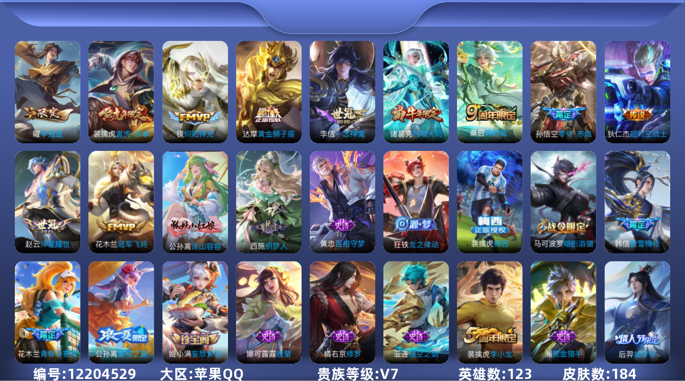 [12204529]V7 11传说 123英雄 184皮肤 可修改实名 优质装备:黄金狮子座,冠军飞将,炽阳神光,一念神魔,零号·赤焰,李逍遥,淬星耀世,超时空战士-狄仁杰,涂山容容 珍宝阁皮:妄想食味 限定皮:逐霄战戟,鸣野蒿,梅西,傲雪梅枪,时雨天司(水龙头),李小龙,如梦令-后羿,青春决赛季,蜜橘之夏,寅虎·赤拳(老虎年限) 史诗皮:星界战将,龙之律动,破空之剑,百相守梦-黄忠,织梦人,特工魅影,千年之狐,永昼,江河有灵,蒙恬荣光圣徽,冰冠公主,偶像歌手,晚萤,末日机甲-吕布,猫狗日记-孙策,乱世虎臣,修罗,摇滚巨星,水果甜心,星夜王子,德古拉伯爵,暗隐猎兽者,幽灵船长,鬼剑武藏,心灵战警,地狱岩魂,纤云弄巧,繁星吟游(呼啦呼啦),逐浪之夏,月团寄思,水晶猎龙者,曙光守护者,金属风暴,原初追逐者,鹰眼统帅,赏金猎手,未来纪元-赵云
