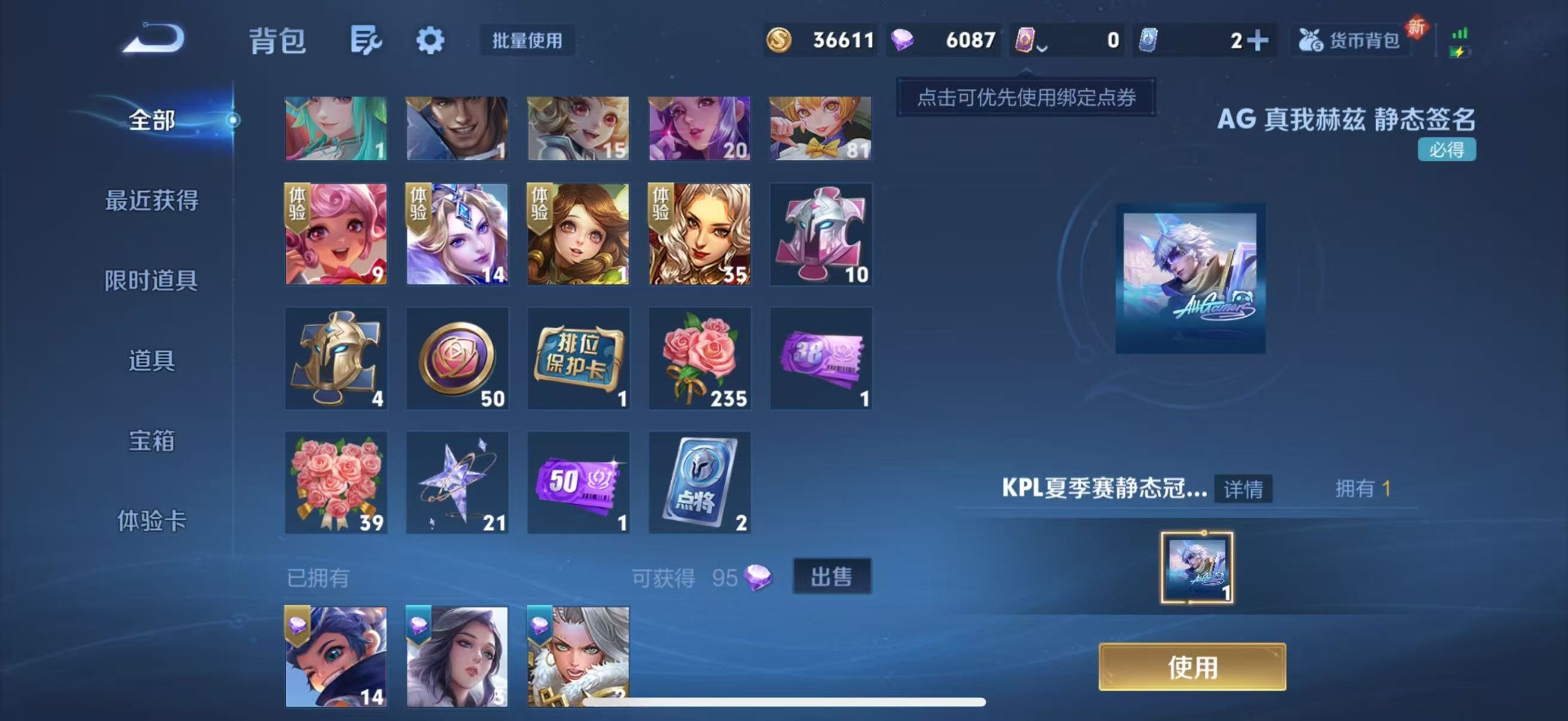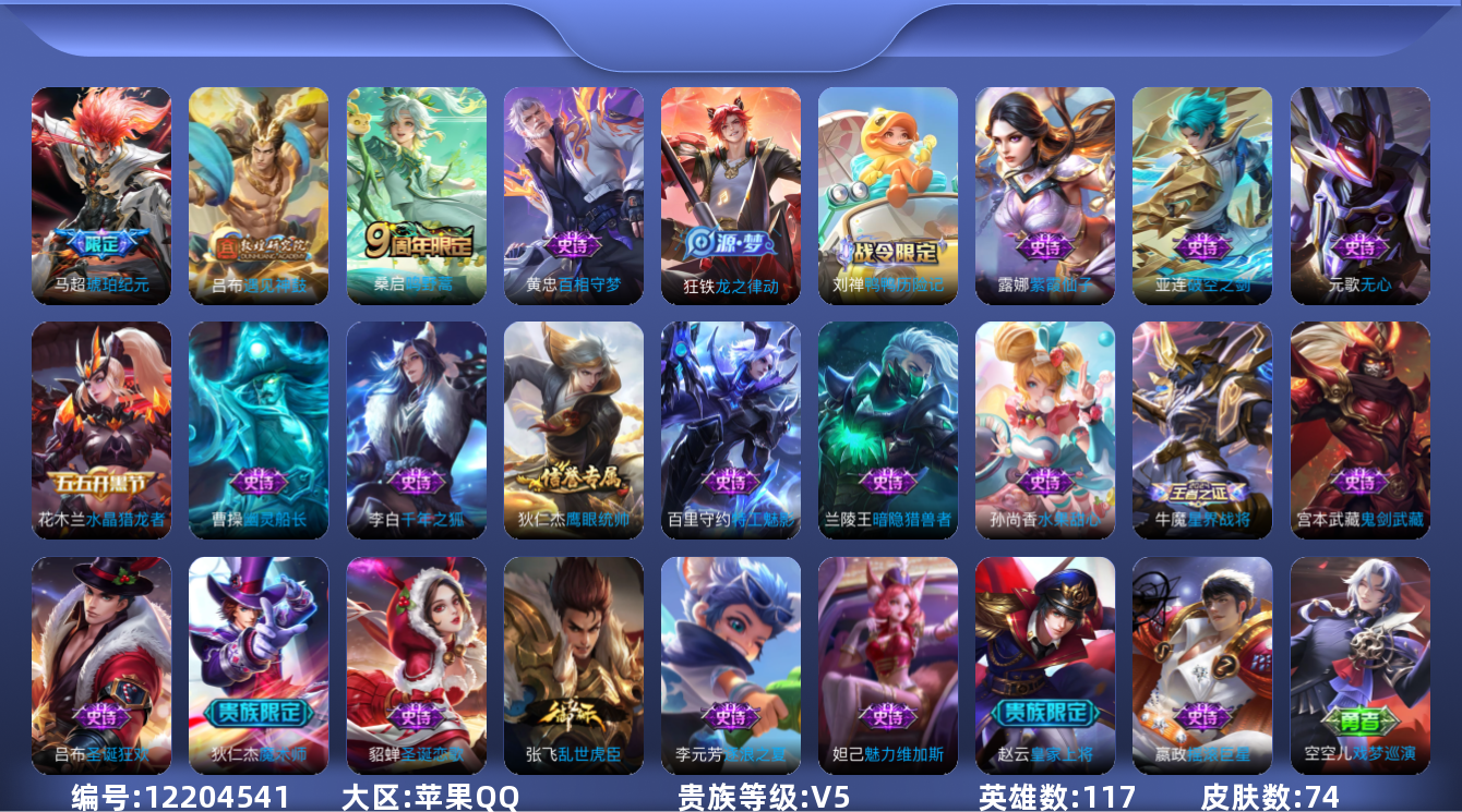 - [11528875]V7 1典藏 2珍品传说 16传说 125英雄 242皮肤 可修改实名 优质装备:鸣剑·曳影,江户川柯南,怪盗基德,一念神魔,仲夏夜之梦(大飞蛾),胖达荣荣,超时空战士-狄仁杰 传说皮:星之鸣奏,祥瑞亨通,幻光神枪 珍宝阁皮:妄想食味,蔷薇恋人 限定皮:愿照·九州拓(澜年限),愿照·福禄聚(蔡文姬年限),愿照·岁时盈(虞姬年限),愿照·山河定(司空震年限),愿照·众生和(妲己年限),愿照·千秋盛(女娲年限),逐霄战戟,鸣野蒿,异界灵契(白毛香),傲雪梅枪,绯月行,神威(电光马子),高山流水,五谷丰年,梁祝,岱宗(典韦年限),李小龙,孙行者,玉兔公主 史诗皮:狼魂孤将,化蝶舞,星界战将,茶境仙,破空之剑,芈月浮光幕影,琥珀纪元伽罗,上官婉儿群星魔术团,百相守梦-百里守约,紫霞仙子,千年之狐,江河有灵,百解令(蒙犽),高渐离燃音魔法,冰冠公主,暗夜猫娘,猫狗日记-孙策,乱世虎臣,修罗,女仆咖啡,水果甜心,天才门将,星夜王子,心灵骇客,时之奇旅-安琪拉,暗隐猎兽者,幽灵船长,鬼剑武藏,乐园奇幻夜,舞动绿茵,纤云弄巧,繁星吟游(呼啦呼啦),拒霜思,乘风破浪,逐浪之夏,水晶猎龙者,金属风暴,原初追逐者,圣诞狂欢,圣诞恋歌,鹰眼统帅,魅力维加斯,未来纪元-赵云