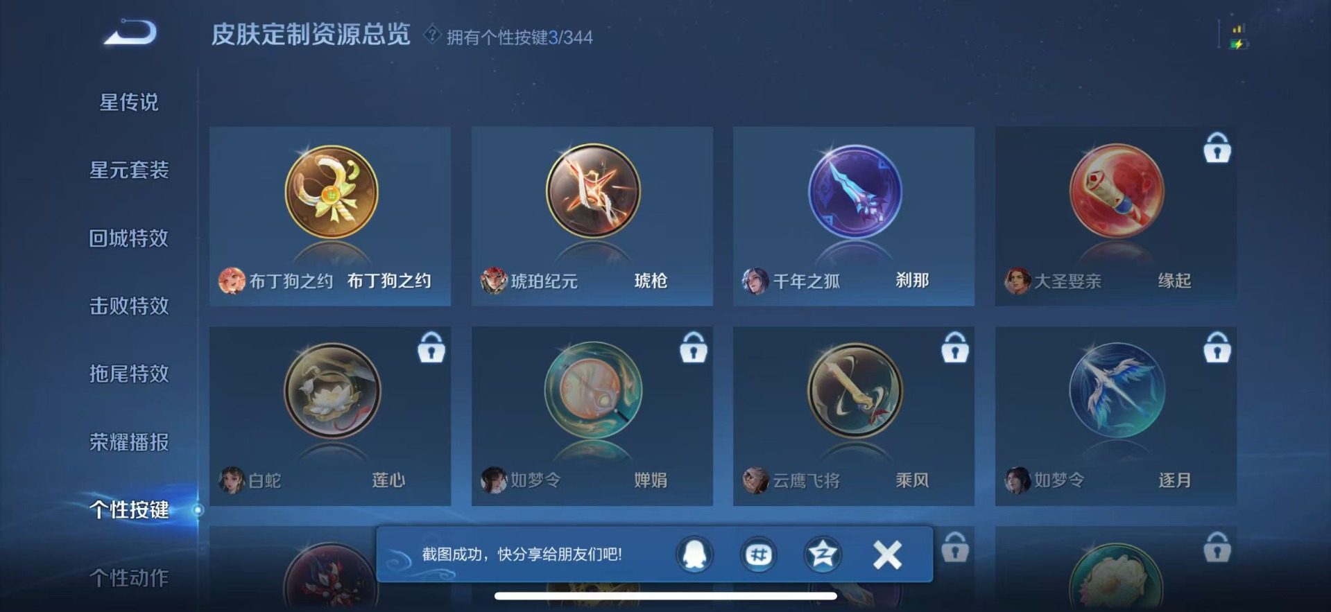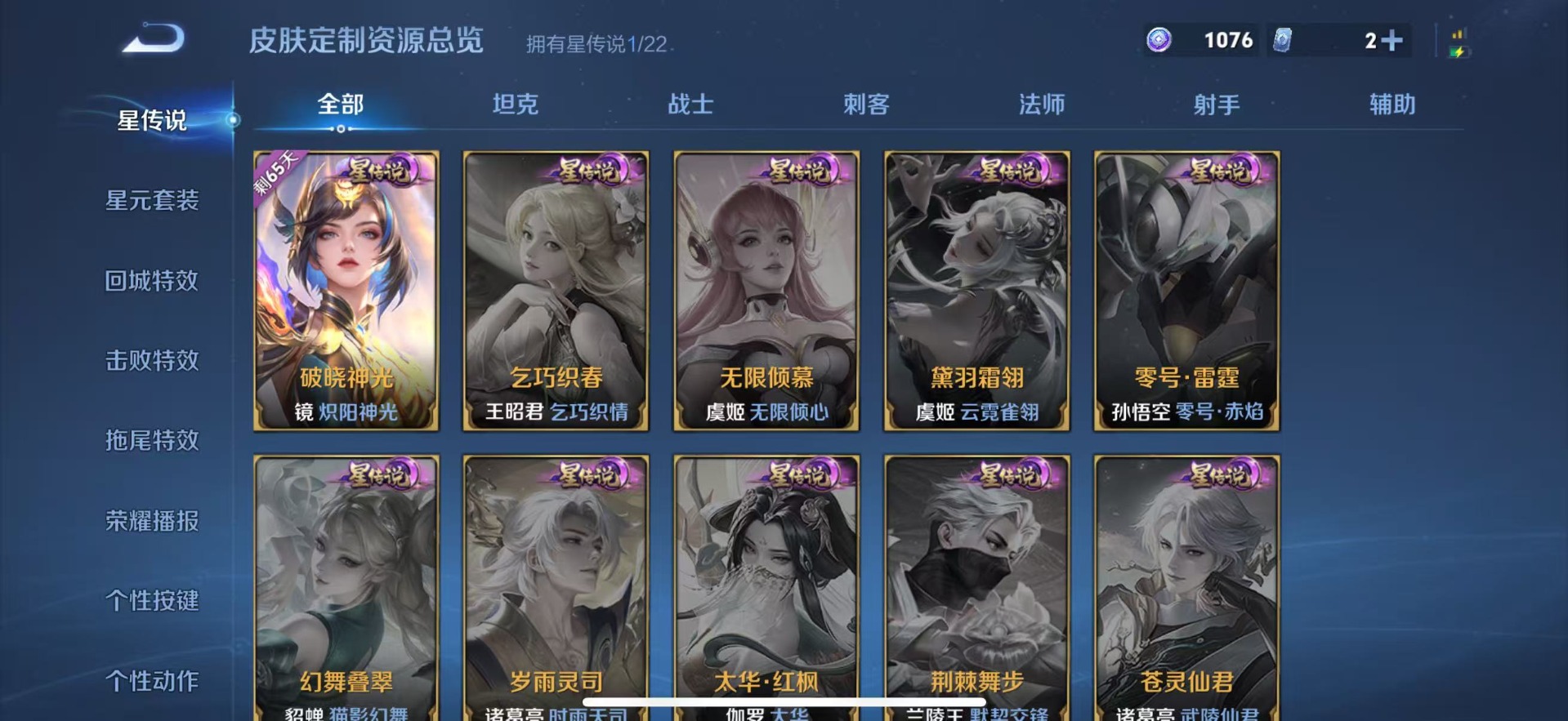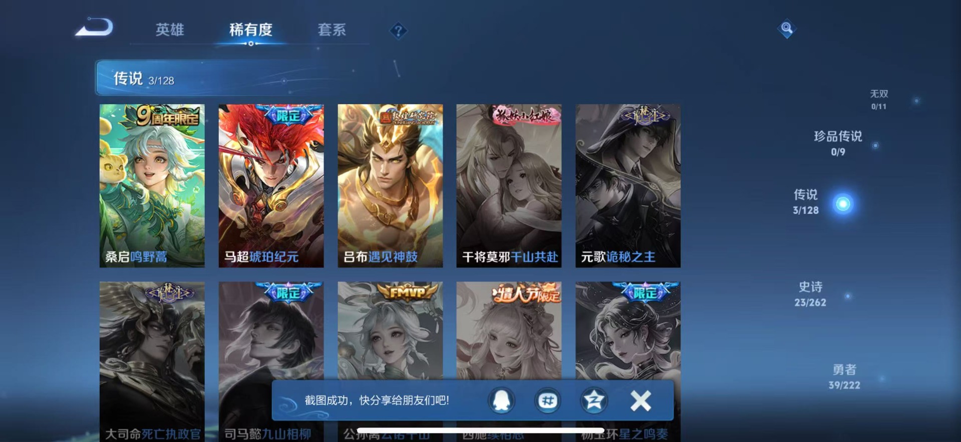 宫本武藏鬼剑武藏,兰陵王暗隐猎兽者,貂蝉圣诞恋歌,花木兰水晶猎龙者,李白千年之狐,曹操幽灵船长,嬴政摇滚巨星,李元芳逐浪之夏,百里守约特工魅影,吕布圣诞狂欢,露娜紫霞仙子