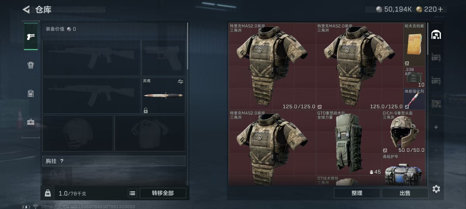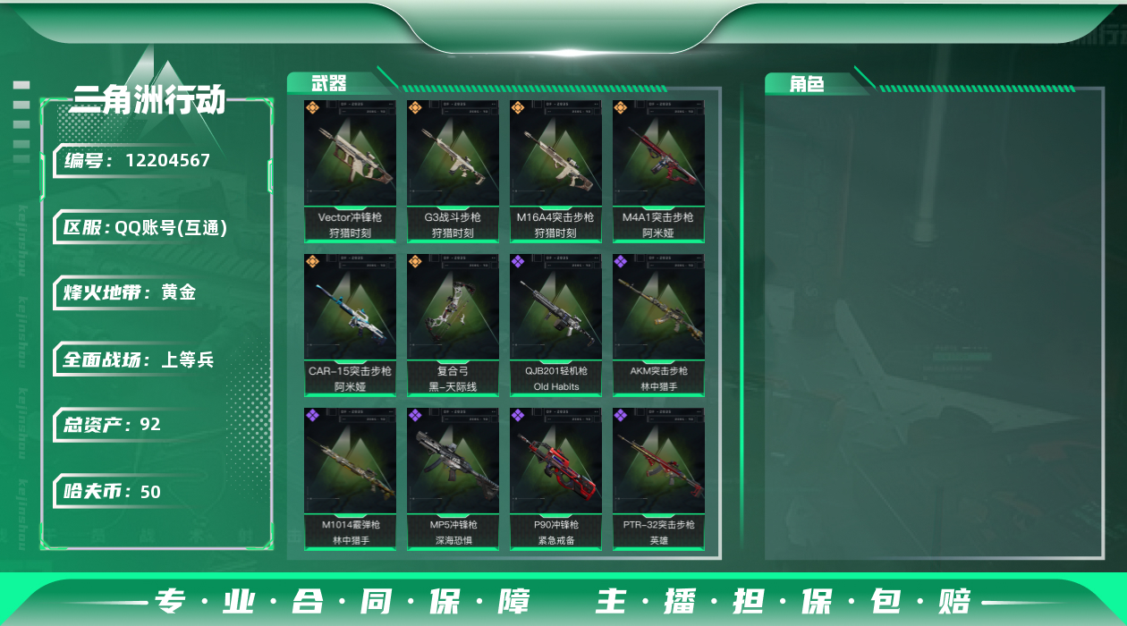 [12204567]总资产:92.3M 6传说枪械 哈夫币:50.194K 可二次 可修改实名 烽火地带段位:黄金 全面战场段位:上等兵 传说武器皮肤:M16A4突击步枪-狩猎时刻,M4A1突击步枪-阿米娅,CAR-15突击步枪-阿米娅,复合弓-黑-天际线,Vector冲锋枪-狩猎时刻,G3战斗步枪-狩猎时刻 史诗武器皮肤:M1014霰弹枪-林中猎手,SCAR-H战斗步枪-囚徒,SV-98狙击步枪-林中猎手,PTR-32突击步枪-英雄,SV-98狙击步枪-囚徒,P90冲锋枪-紧急戒备,QJB201轻机枪-Old Habits,QBZ95-1突击步枪-曙光,MP5冲锋枪-深海恐惧,AKM突击步枪-林中猎手