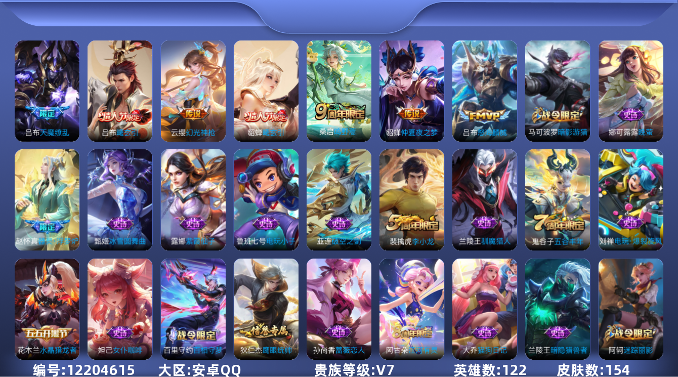 [12204615]V7 7传说 122英雄 154皮肤 可修改实名 优质装备:仲夏夜之梦(大飞蛾) 传说皮:貂蝉曦玄引,吕布曦玄引,幻光神枪 珍宝阁皮:蔷薇恋人 限定皮:逐霄战戟,鸣野蒿,高山流水,怒海麟威,五谷丰年,李小龙,天魔缭乱 史诗皮:器灵·浮梦炉,星界战将,茶境仙,撼地雄心,破空之剑,蔬乡物语(鲁班七号),百相守梦-百里守约,紫霞仙子,电玩小子(小书包),冰冠公主,江河有灵,电玩·爆裂旋风,晚萤,猫狗日记-孙策,猫狗日记-大乔,乱世虎臣,女仆咖啡,水果甜心,德古拉伯爵,暗隐猎兽者,鬼剑武藏,心灵战警,乐园奇幻夜,舞动绿茵,水晶猎龙者,金属风暴,圣诞狂欢,鹰眼统帅