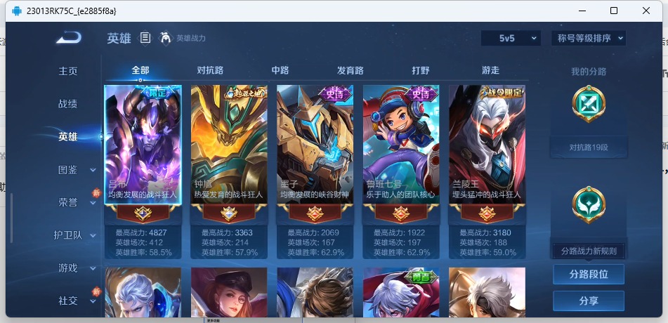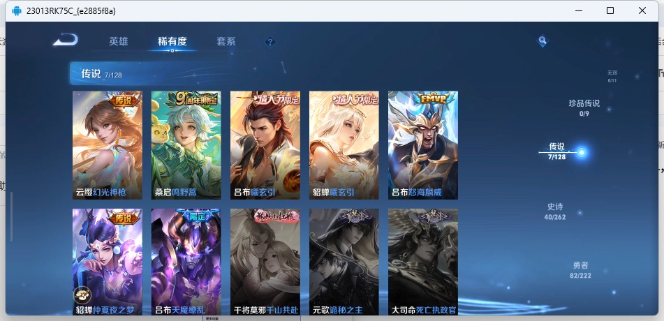 - [12073827]V5 5传说 104英雄 96皮肤 可修改实名 女号 传说皮:云诺千山,幻光神枪 限定皮:愿照·福禄聚(蔡文姬年限),愿照·众生和(妲己年限),鸣野蒿,五谷丰年 史诗皮:龙之律动,蒙犽顽岩魄,织梦人,偶像歌手,乱世虎臣,水果甜心,天才门将,心灵骇客,鬼剑武藏,水晶猎龙者,箭羽风息,鹰眼统帅,魅力维加斯,未来纪元-赵云