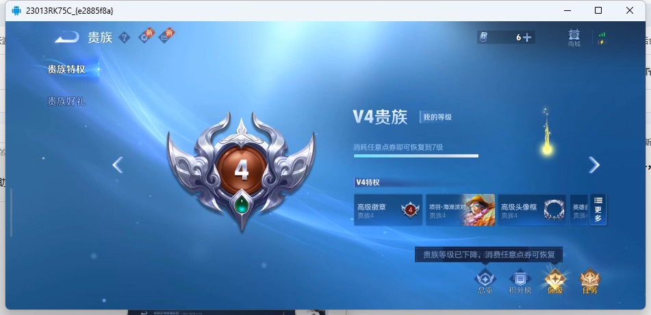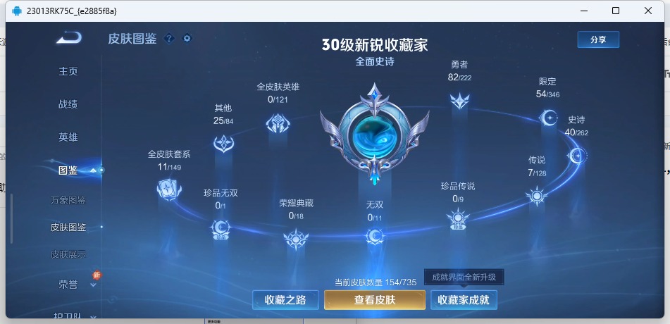 - PX_2095850-实名: 不可修改 贵族等级: V7 英雄数: 124 皮肤数: 244 无双皮: 小乔时之魔女 珍品传说: 酷洛米之心 星传说: 金色仲夏夜 传说皮: 黄金狮子座,猫影幻舞,一念神魔,仲夏夜之梦,山海·琳琅生,貂蝉曦玄引,星之鸣奏 限定皮: 李小龙,游园惊梦,魔法小厨娘,异界灵契,白晶晶,大圣娶亲,高山流水,孙行者,猪悟能,傲雪梅枪,寅虎·心曲,山海·碧波行,鸣野蒿,陌上桑,