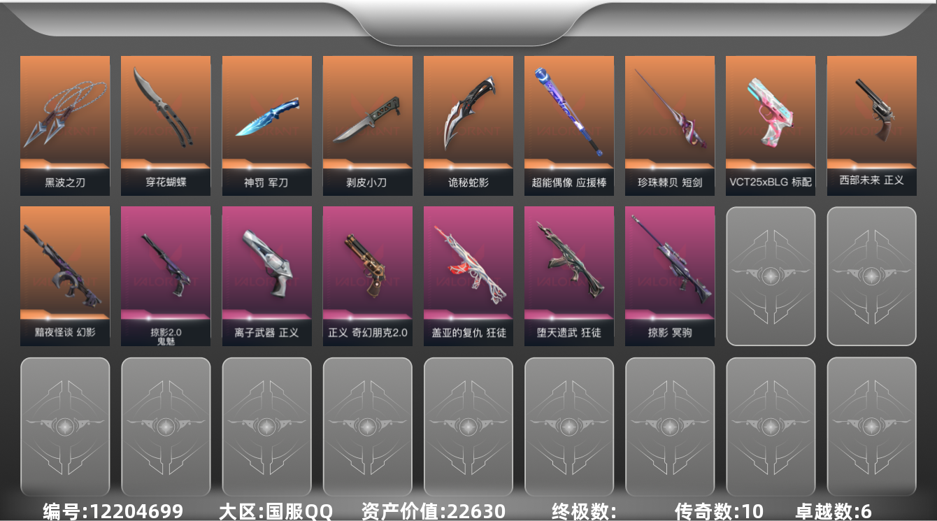 - [11947047]【套装】:2022全球冠军赛套装,离子武器//2.0套装 【英雄】:幻棱,炼狱,维斯,暮蝶,钛狐,壹决,铁臂,捷风,雷兹,幽影,不死鸟,贤者,猎枭,蝰蛇,零,芮娜,奇乐,尚勃勒,霓虹,斯凯,夜露,星礈,K/O,海神,盖可,黑梦,钢锁 【近战 武器】:近战武器-2022全球冠军赛 蝴蝶刀,近战武器-黑波之刃,近战武器-离子武器//2.0 爪刀,近战武器-诡秘蛇影 军刀 【狂徒】:狂徒-RGX 11z Pro,狂徒-堕天遗武,狂徒-紫阙金琅,狂徒-离子武器//2.0,狂徒-诡秘蛇影 【幻影】:幻影-2022全球冠军赛,幻影-末日之翼 【戍卫】:戍卫-折光棱晶 【冥驹】:冥驹-千灵华绽 【飞将】:飞将-末日之翼 【莽侠】:莽侠-诡秘蛇影 【战神】:战神-离子武器//2.0 【奥丁】:奥丁-末日之翼 【判官】:判官-诡秘蛇影 【骇灵】:骇灵-离子武器//2.0 【蜂刺】:蜂刺-折光棱晶 【标配】:标配-折光棱晶 【正义】:正义-离子武器 【鬼魅】:鬼魅-诡秘蛇影,鬼魅-星云暗涌 【狂怒】:狂怒-离子武器//2.0 【短炮】:短炮-末日之翼 【卡面】:南瓜盛典 卡面,唱片的故事 卡面,树懒大作战 卡面,红鳞松叶 卡面,无畏契约GO!第一卷:芮娜 卡面,清除名单 卡面,无畏契约GO!第一卷:零 卡面,无垠星环 卡面,《双城之战》金克丝 卡面,无畏契约GO!第一卷:贤者 卡面,代号红色 卡面,新兵报到 卡面,V契约 卡面,无畏契约 卡面 【喷漆】:买装还是存钱 喷漆,酷熊冲浪 喷漆,无畏契约GO!第一卷:芮娜 喷漆,胜利属于无畏契约 喷漆,GLHF 喷漆,无畏契约 喷漆 【挂饰】:第九季//第三幕 纪念币 挂饰,天外飞客 挂饰,好运福爪 挂饰,《双城之战》魄罗 挂饰,无畏契约 纪念币 挂饰