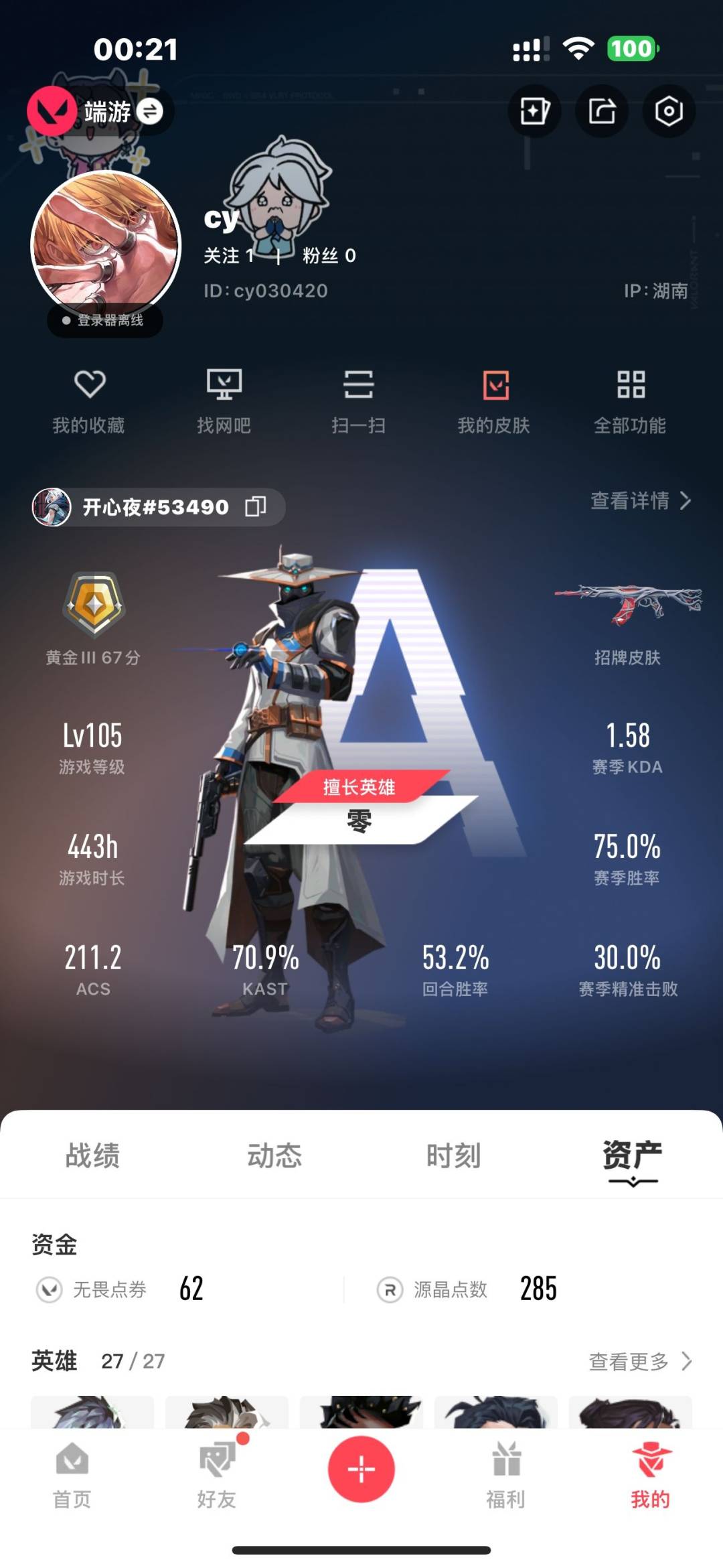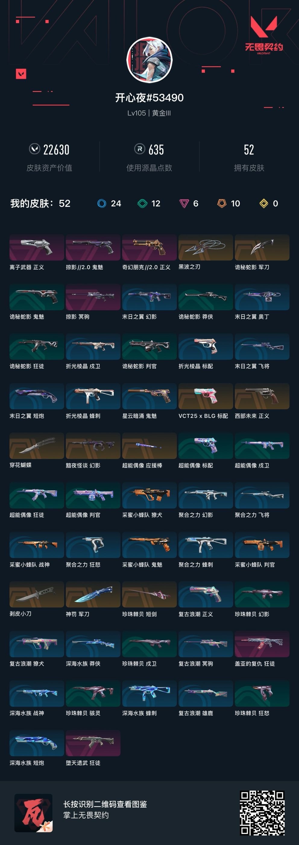 [12204699]10橙皮 6紫皮 52皮肤 27英雄 100卡面 635已用源晶 黄金 优质装备:狂徒-盖亚的复仇,正义-离子武器,幻影-黯夜怪谈,冥驹-掠影,军刀-神罚,剥皮小刀,黑波之刃,穿花蝴蝶,诡秘蛇影 佩枪皮肤:标配-VCT25xBLG,正义-奇幻朋克2.0,鬼魅-掠影2.0,正义-西部未来 步枪皮肤:狂徒-堕天遗武 近战武器皮肤:短剑-珍珠棘贝,超能偶像 应援棒