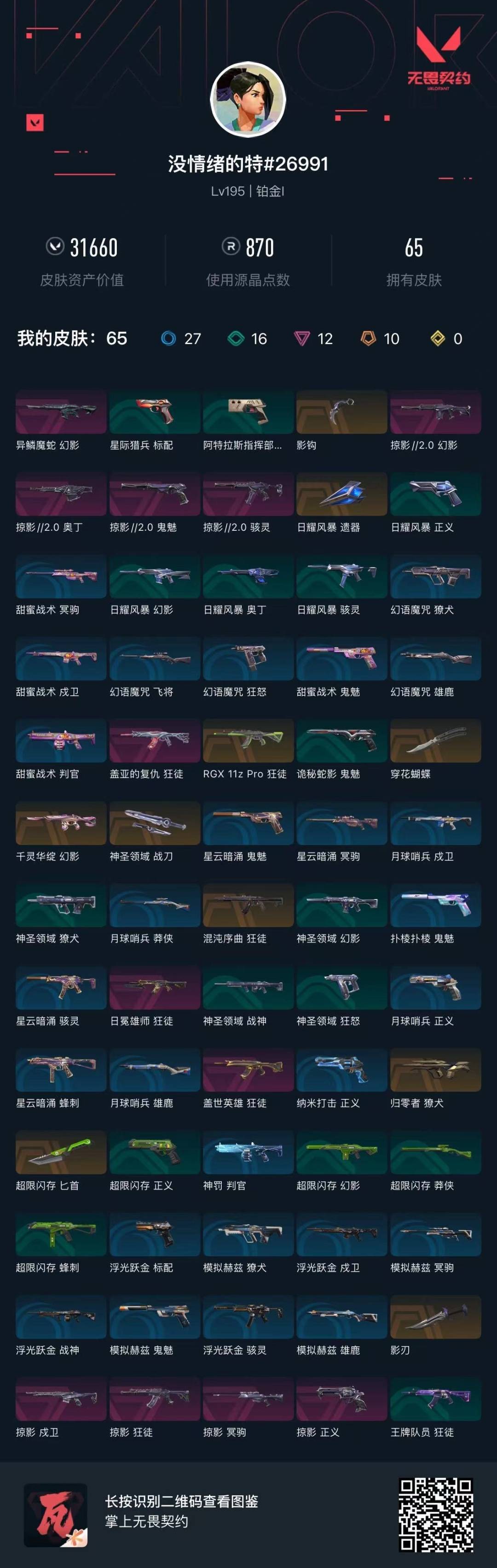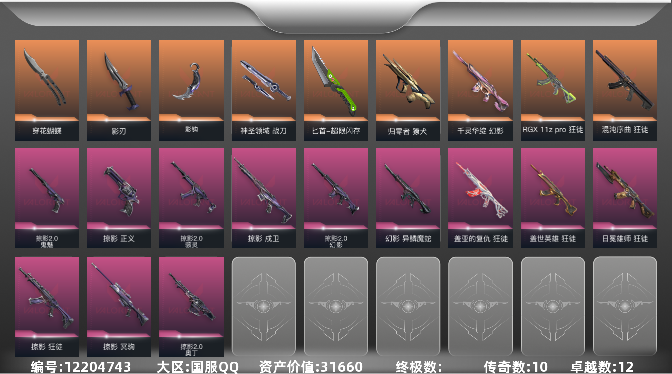 [12204743]10橙皮 12紫皮 65皮肤 24英雄 103卡面 870已用源晶 铂金 优质装备:掠影套装,幻影-千灵华绽,狂徒-混沌序曲,狂徒-掠影,狂徒-盖亚的复仇,獠犬-归零者,狂徒-日冕雄师,正义-掠影,冥驹-掠影,戍卫-掠影,狂徒-盖世英雄,匕首-超限闪存,影刃,穿花蝴蝶,神圣领域 战刀,影钩 套装:掠影2.0套装 佩枪皮肤:鬼魅-掠影2.0 冲锋枪皮肤:骇灵-掠影2.0 步枪皮肤:幻影-异鳞魔蛇,幻影-掠影2.0,RGX 11z pro 狂徒 机枪皮肤:奥丁-掠影2.0