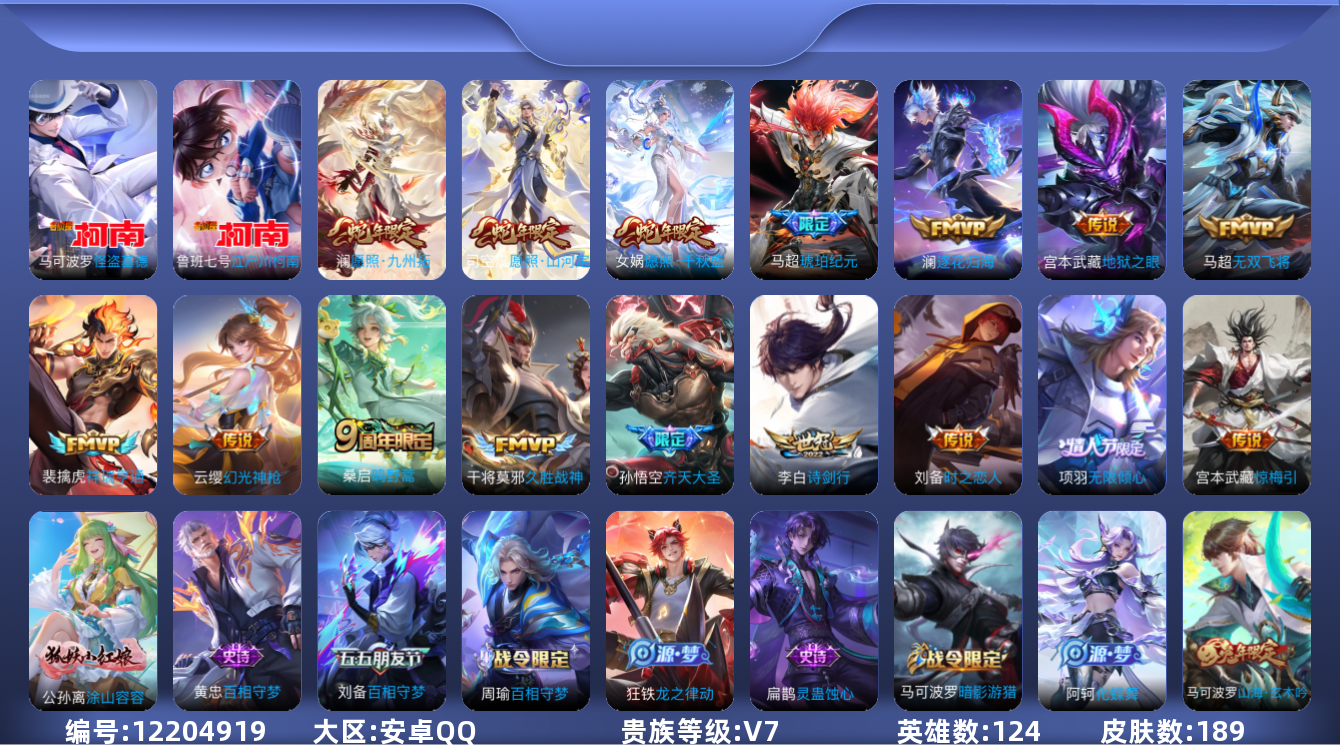 [12204919]V7 2珍品传说 16传说 124英雄 189皮肤 可修改实名 优质装备:江户川柯南,怪盗基德,久胜战神,地狱之眼,时之恋人-刘备(电焊工),无双飞将,惊梅引,澜逐花归海,琥珀纪元马超,涂山容容 传说皮:祥瑞亨通,幻光神枪 珍宝阁皮:蔷薇恋人,女武神 限定皮:愿照·九州拓(澜年限),愿照·山河定(司空震年限),愿照·千秋盛(女娲年限),逐霄战戟,鸣野蒿,飞衡(韩信年限),无限倾心-项羽,诗剑行,齐天大圣,五谷丰年,梁祝,龙胆,李小龙,山海·玄木吟(马可年限) 史诗皮:器灵·浮梦炉,化蝶舞,灵蛊蚀心,星界战将,谪仙醉月,龙之律动,百相守梦-周瑜,茶境仙,百相守梦-黄忠,特工魅影,江河有灵,蒙恬荣光圣徽,电玩·爆裂旋风,百相守梦(刘备),猫狗日记-孙策,猫狗日记-大乔,节奏热浪,摇滚巨星,水果甜心,星夜王子,德古拉伯爵,暗隐猎兽者,幽灵船长,鬼剑武藏,心灵战警,纤云弄巧,拒霜思,缤纷独角兽,水晶猎龙者,曙光守护者,金属风暴,圣诞狂欢,圣诞恋歌,鹰眼统帅,魅力维加斯,黎明之约,赏金猎手