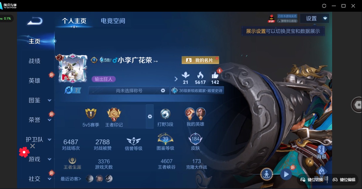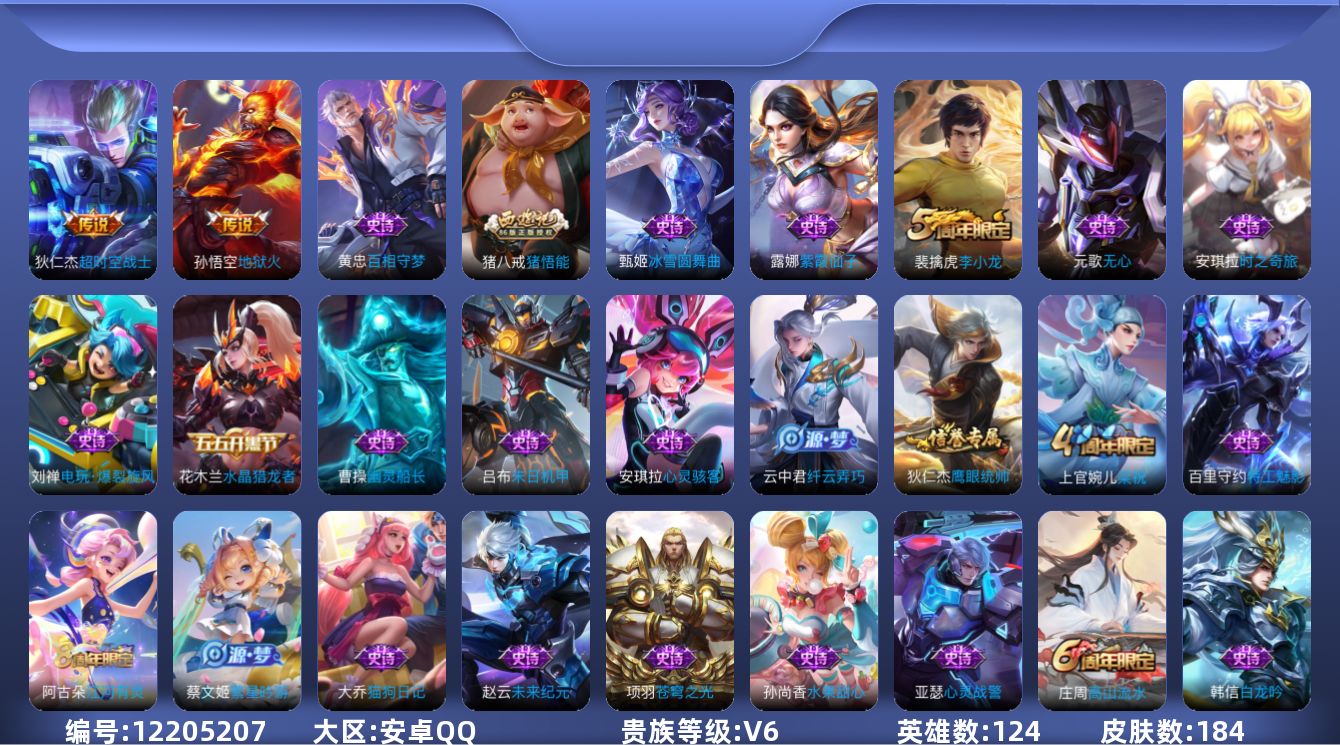 [12205207]V6 2传说 124英雄 184皮肤 可修改实名 优质装备:地狱火,超时空战士-狄仁杰 珍宝阁皮:胡桃夹子,优雅恋人 限定皮:高山流水,梁祝,奔雷神使(牛魔年限),李小龙,猪悟能 史诗皮:百相守梦-黄忠,紫霞仙子,苍穹之光,白龙吟,特工魅影,江河有灵,百解令(蒙犽),电玩·爆裂旋风,末日机甲-吕布,猫狗日记-大乔,乱世虎臣,摇滚巨星,水果甜心,绅士熊喵,天才门将,心灵骇客,时之奇旅-安琪拉,功夫厨神,德古拉伯爵,幽灵船长,鬼剑武藏,心灵战警,纤云弄巧,繁星吟游(呼啦呼啦),水晶猎龙者,金属风暴,圣诞狂欢,鹰眼统帅,王者之锤,魅力维加斯,无心,未来纪元-赵云