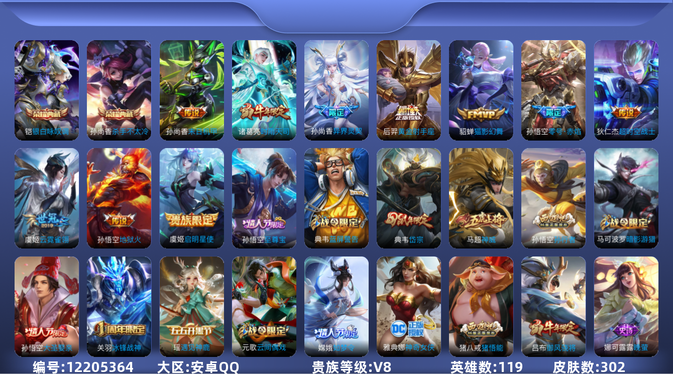 [12205364]【商品标题】:安卓Q-V0-秩序白银II段位-119英雄-302皮肤-2典藏-0珍品无双-0无双-0珍品传说-10传说-97史诗
