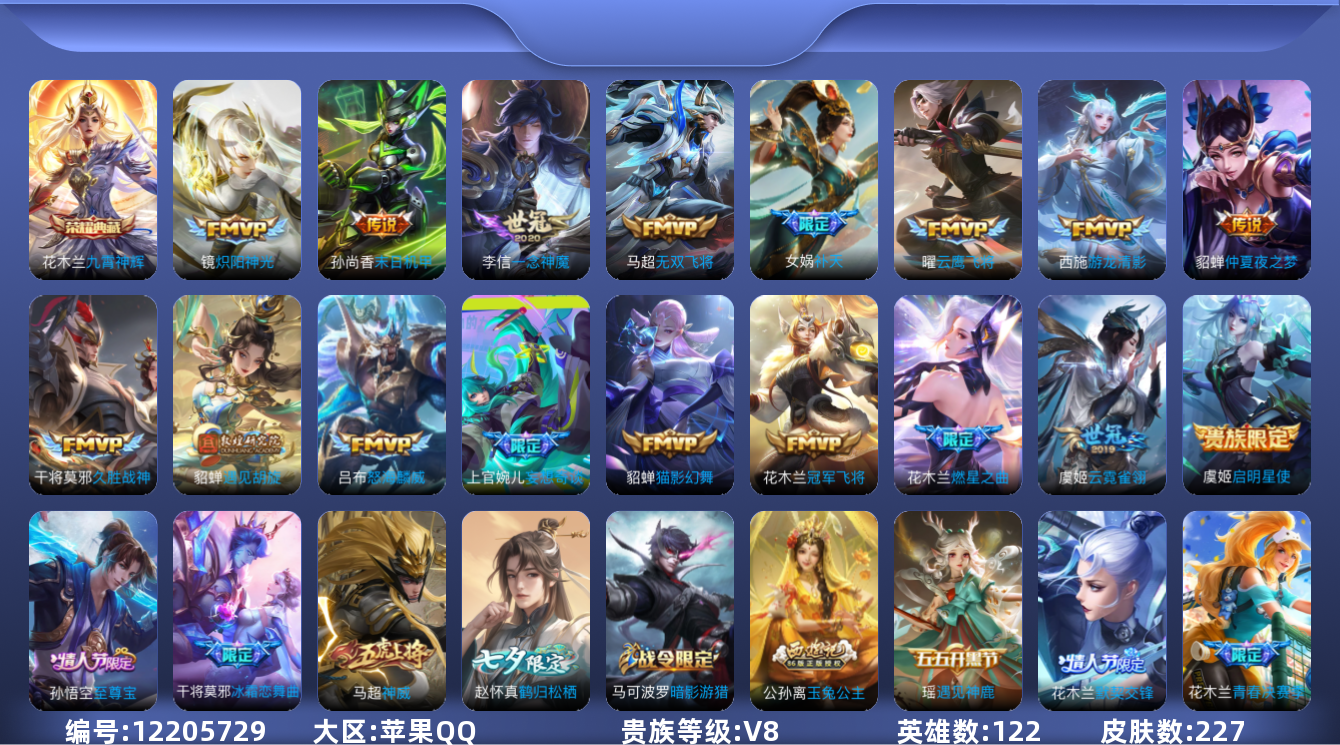 [12205729]V8 1典藏 17传说 122英雄 227皮肤 可修改实名 优质装备:九霄神辉(木兰典藏),冠军飞将,云鹰飞将(小将军),猫影幻舞,久胜战神,炽阳神光,一念神魔,云霓雀翎,末日机甲-孙尚香(绿蚂蚱),仲夏夜之梦(大飞蛾),游龙清影(小青龙),遇见胡旋,无双飞将,燃星之曲,妄想奇谈 珍宝阁皮:优雅恋人 限定皮:至尊宝,凤凰于飞,补天,时之彼端,神威(电光马子),瑞麟志(木兰年限),高山流水,怒海麟威,五谷丰年,游园惊梦,梁祝,天狼溯光者,李小龙,霸王别姬-虞姬,默契交锋-花木兰,一生所爱,青春决赛季,冰霜恋舞曲,乒乒小将,蜜橘之夏,寅虎·心曲(虎婆),玉兔公主 史诗皮:遇见神鹿,紫霞仙子,白龙吟,特工魅影,鹤归松栖(赵怀真),魅语,蒙恬荣光圣徽,冰冠公主,青蛇,偶像歌手,晚萤,时之恋人-孙尚香,乱世虎臣,修罗,女仆咖啡,摇滚巨星,水果甜心,心灵骇客,德古拉伯爵,幽灵船长,鬼剑武藏,诗语江南,纤云弄巧,拒霜思,缤纷独角兽,乘风破浪,月团寄思,水晶猎龙者,唤灵魅影,金属风暴,原初追逐者,圣诞狂欢,鹰眼统帅,魅力维加斯,黎明之约,天秀·音浪,未来纪元-赵云