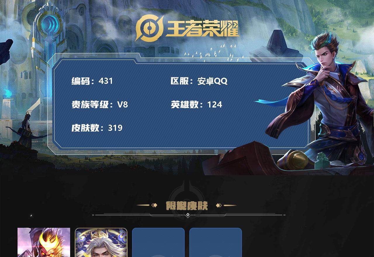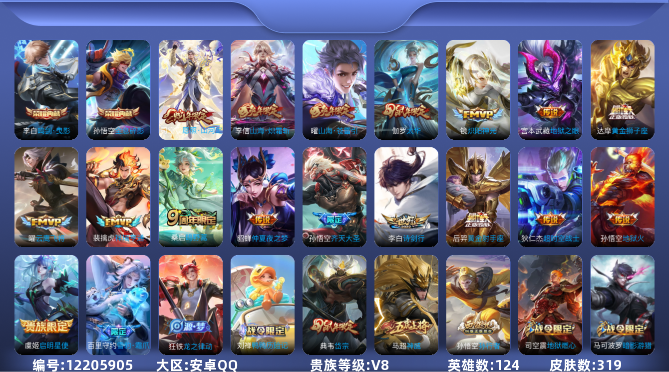 [12205905]【商品标题】:安卓Q-V8-至尊星耀I段位-124英雄-319皮肤-2典藏-0珍品无双-0无双-0珍品传说-17传说-90史诗