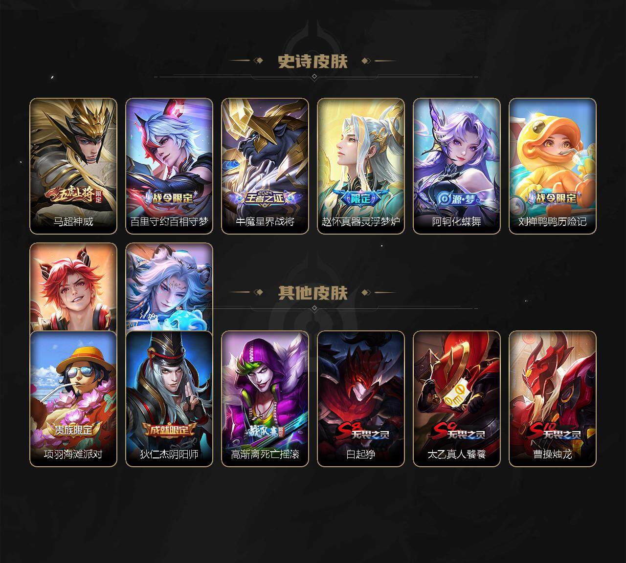 【赛季限定】:白起狰,夏侯惇朔风刀,曹操烛龙,典韦穷奇,狄仁杰万华元夜,达摩沙漠行僧,老夫子醍醐杖,程咬金演武夺筹,兰陵王金庭之子,张良古海寻踪,牛魔御旌,李元芳云中旅人,钟馗驱傩正仪,雅典娜黎明之约,太乙真人饕餮,鬼谷子原