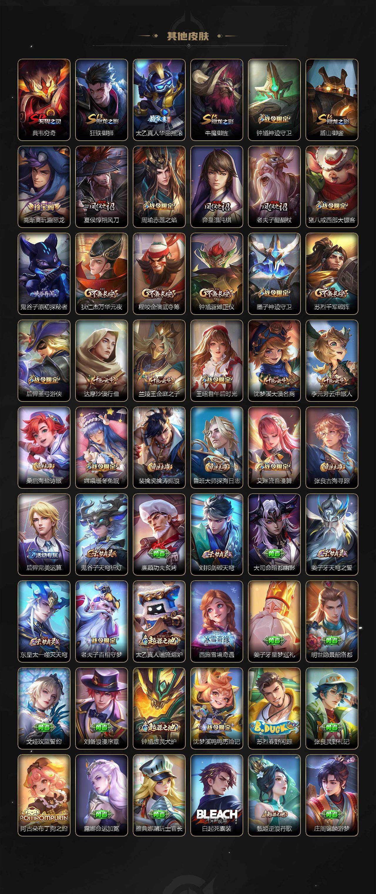 伽罗箭羽风息,李元芳逐浪之夏,不知火舞魅语,孙策猫狗日记,阿轲节奏热浪,露娜紫霞仙子,诸葛亮黄金分割率,王昭君偶像歌手,韩信白龙吟,雅典娜冰冠公主,吕布末日机甲,鲁班七号电玩小子,橘右京修罗,墨子龙骑士,刘禅绅士熊喵,刘禅天才门将,白起星夜王子,安琪拉心灵骇客,程咬金功夫厨神,刘邦德古拉伯爵,兰陵王暗隐猎兽者,曹操幽灵船长,宫本武藏鬼剑武藏,司马懿暗渊魔法,亚瑟心灵战警,钟馗乐园奇幻夜,杨戬天秀·启明,蔡文姬舞动绿茵,廉颇地狱岩魂,小乔缤纷独角兽,夏侯惇乘风破浪,花木兰水晶猎龙者,铠曙光守护者,百里玄策热力回旋,墨子金属风暴,百里玄策原初追逐者,吕布圣诞狂欢,貂蝉圣诞恋歌,百里守约特工魅影,嫦娥拒霜思,雅典娜黎明之约,李白千年之狐,澜赏金猎手,刘禅电玩·爆裂旋风,蒙犽百解令,赵怀真器灵·浮梦炉