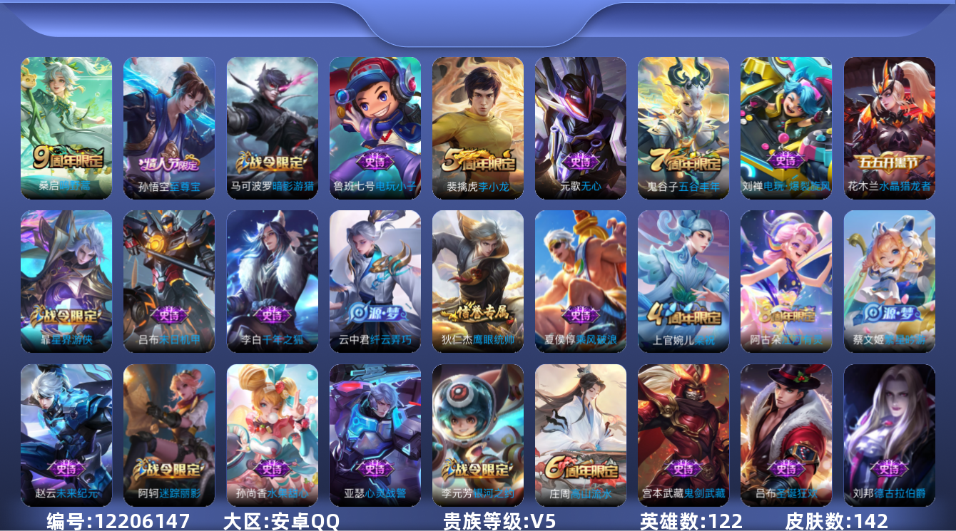 - [11527781]V6 1典藏 3传说 124英雄 138皮肤 可修改实名 优质装备:神鉴启示录 珍宝阁皮:玩趣恶龙 限定皮:愿照·九州拓(澜年限),逐霄战戟,映山客,鸣野蒿,五谷丰年 史诗皮:星界战将,破空之剑,蔬乡物语(鲁班七号),紫霞仙子,黄金分割率,特工魅影,魅语,高渐离燃音魔法,偶像歌手,暗夜猫娘,龙骑士(小龙虾),猫狗日记-孙策,猫狗日记-大乔,乱世虎臣,节奏热浪,摇滚巨星,水果甜心,绅士熊喵,功夫厨神,暗隐猎兽者,幽灵船长,鬼剑武藏,心灵战警,缤纷独角兽,乘风破浪,逐浪之夏,水晶猎龙者,箭羽风息,金属风暴,原初追逐者,圣诞狂欢,圣诞恋歌,鹰眼统帅,无心,未来纪元-赵云