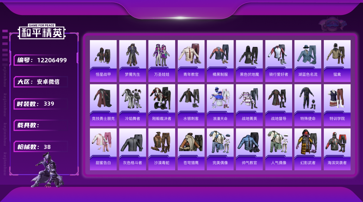 [12206499]可二次 可修改实名 永久社交场景限制 热门装扮:恒星战甲,万圣娃娃,梦魇先生 紫色装扮:青涩时光,圣诞大吉,冷焰舞者,凛冬战士,刚毅裁决者,北国孤狼,午夜朋克,和平特警,坚韧舞者,夜莺强袭者,完美偶像,帅气教官,幻影武者,冰川特警,SS2特训,SS3特训,SS4特训,SS5特训,人气偶像,冰凉西瓜,怒火燎原,战地菁英,青年教官,风暴特警,骑行爱好者,魅力单车,黑色伏地魔,霓虹街区,跃动心情,都市魅力,野性战魂,雪山征服者,雪山精英,雷霆特警,熔岩游骑兵连帽夹克,海滨突袭者,深蓝色名流,湖蓝色名流,派对绅士,灰色格斗者,熔岩使者,战地督导,极地朋克,极速红龙,橘黑制服,沙漠兵团,沙漠毒蛇,特战英豪,竞技达人朋克,绮丽涂鸦,苍穹猎鹰,竞技勇士朋克,特殊使命,特训学院,猛禽,甜蜜告白,甜蜜菠萝,疯狂小兔子,神秘领域,金羽特工,浪漫天命,小丑鱼,SS7特训,SS8特训,SS6特训,黑夜传说,SS11特训,SS10特训,冰原奔狼,水银刺客,WiFi精灵,特种空勤,半糖蓝莓