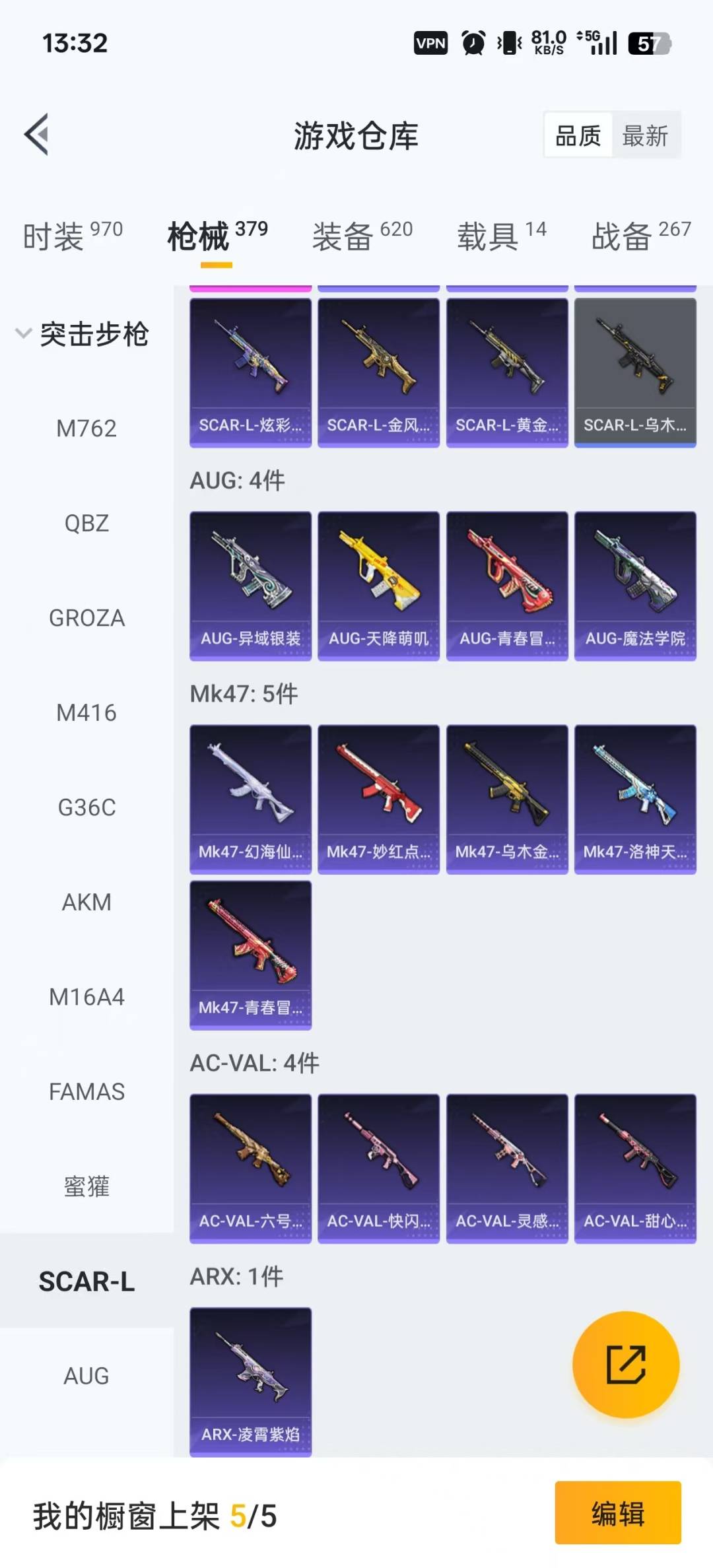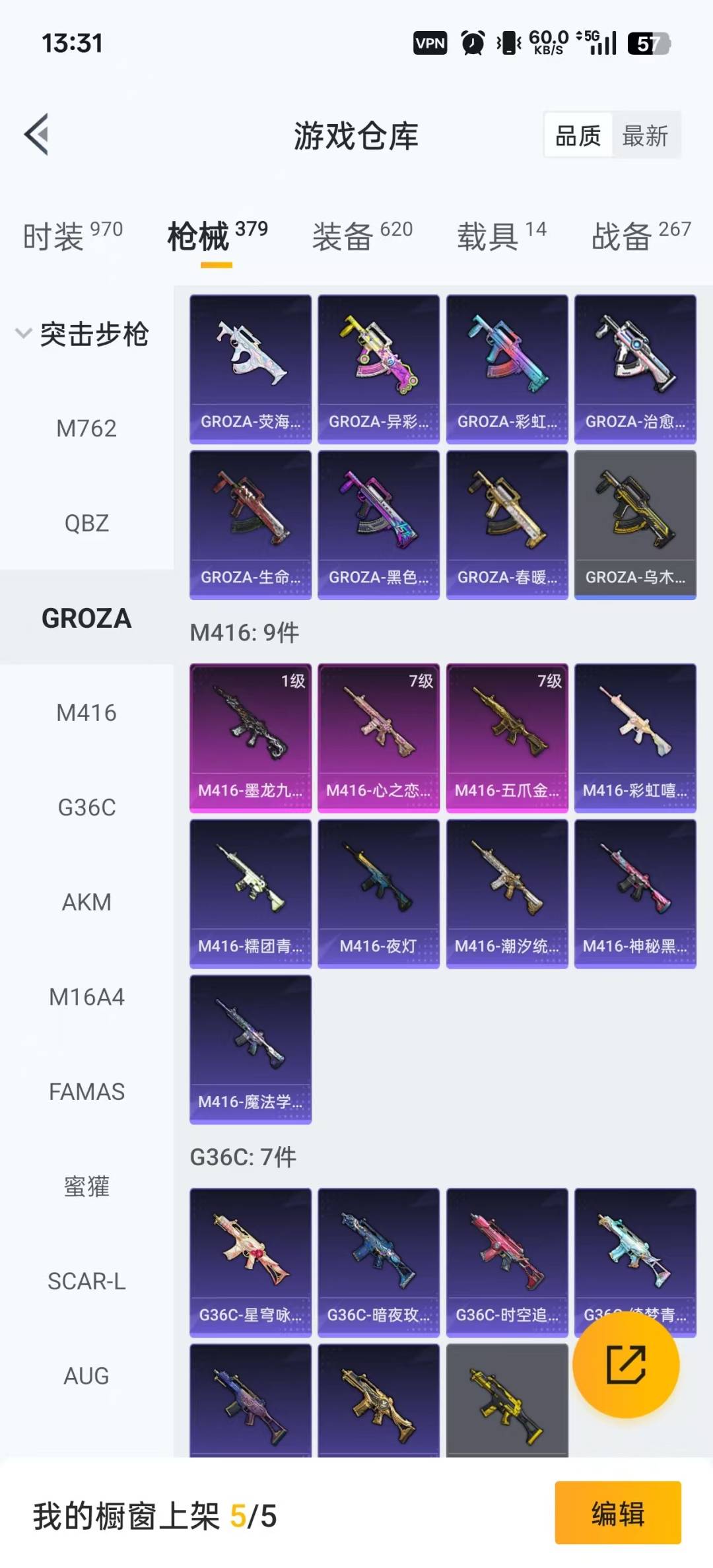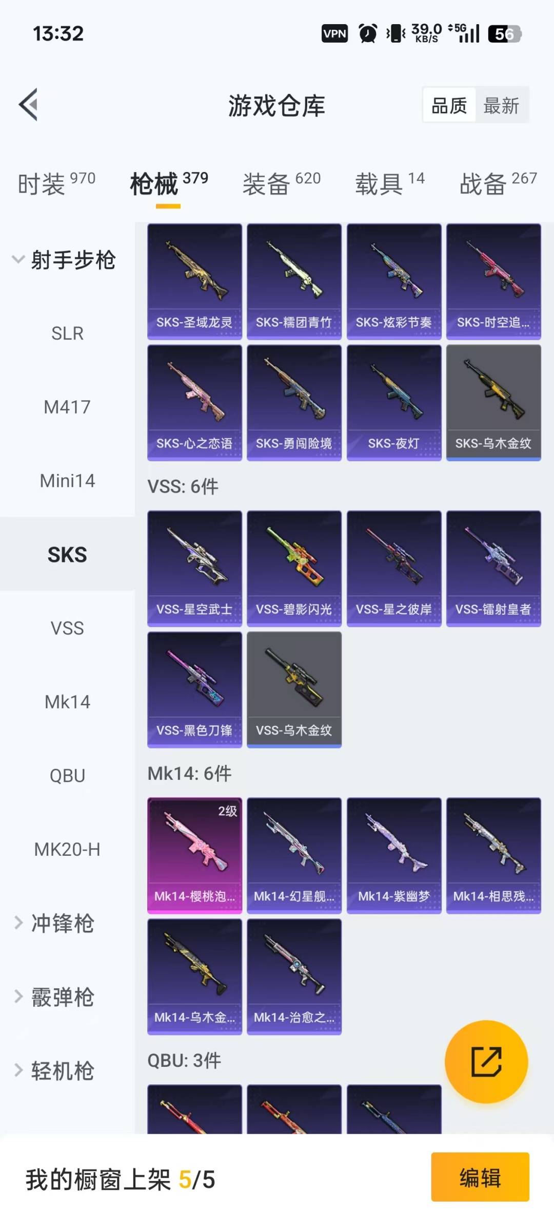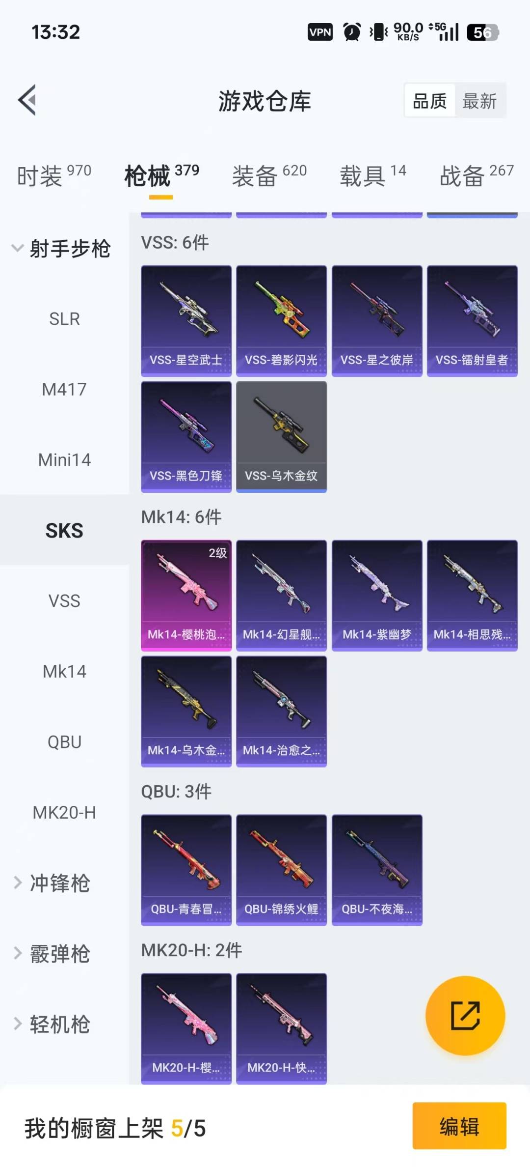M762-激战未来,M416-五爪金龙,M416-墨龙九天,M416-心之恋语,AKM-炫紫旋律,Famas-觉醒初号机,SCAR-L-机甲封神,M24-星之信仰,Kar98K-巳巳如意,Kar98K-伏魔团,Mini14-荧光虫舞,Mk14-樱桃泡泡,UMP45-玉魂晶魄,M249-古战神甲,DP-28-圣堂之誓,MG3-洛神天依,爆炸猎弓-雪梅暗香